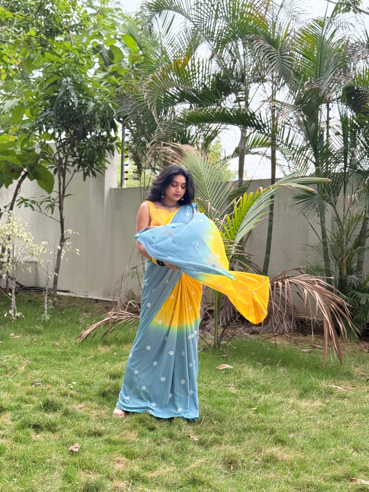 Elegant double-shaded natural dyed georgette saree in soothing blue and yellow tones, adorned with delicate floral embroidery motifs.