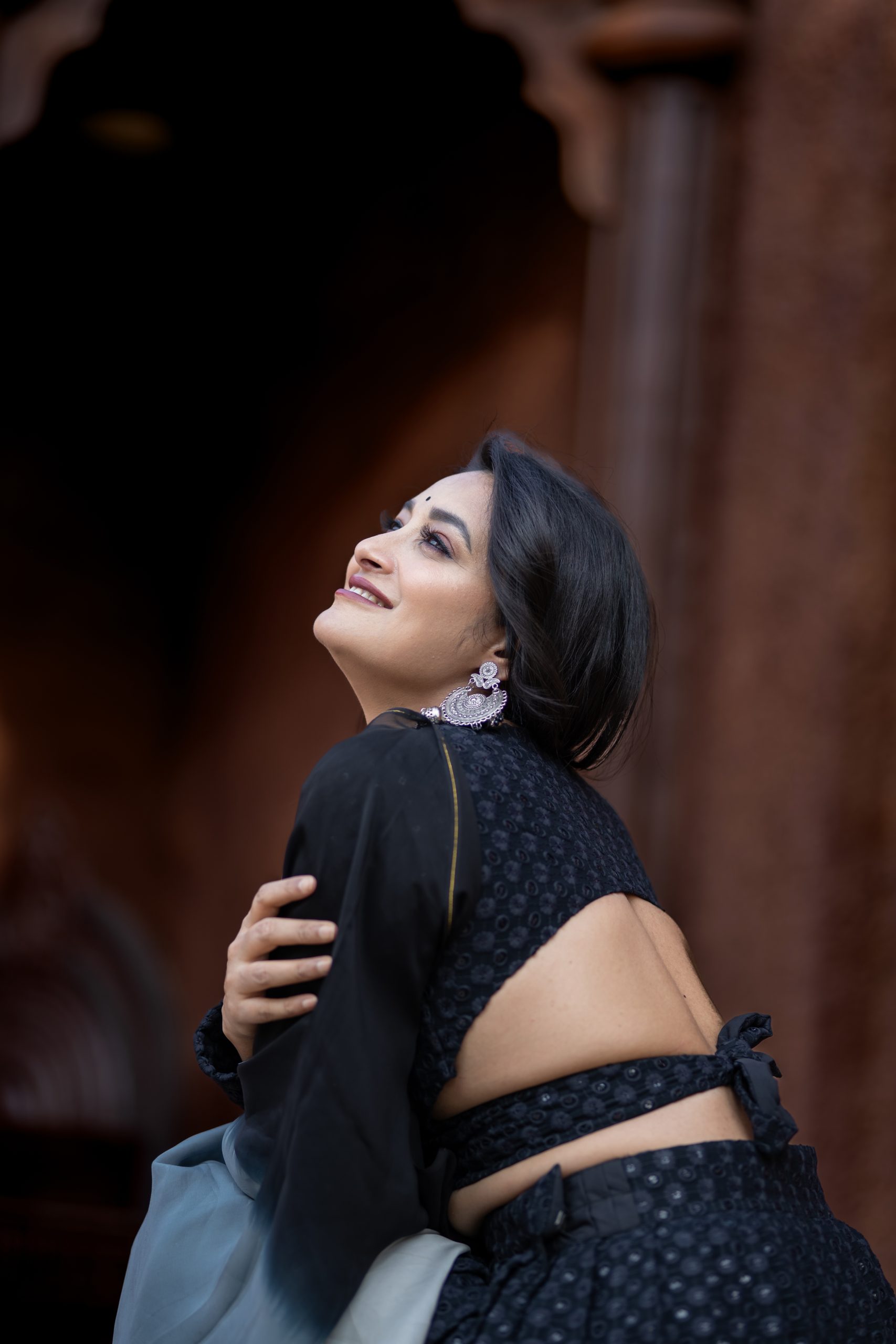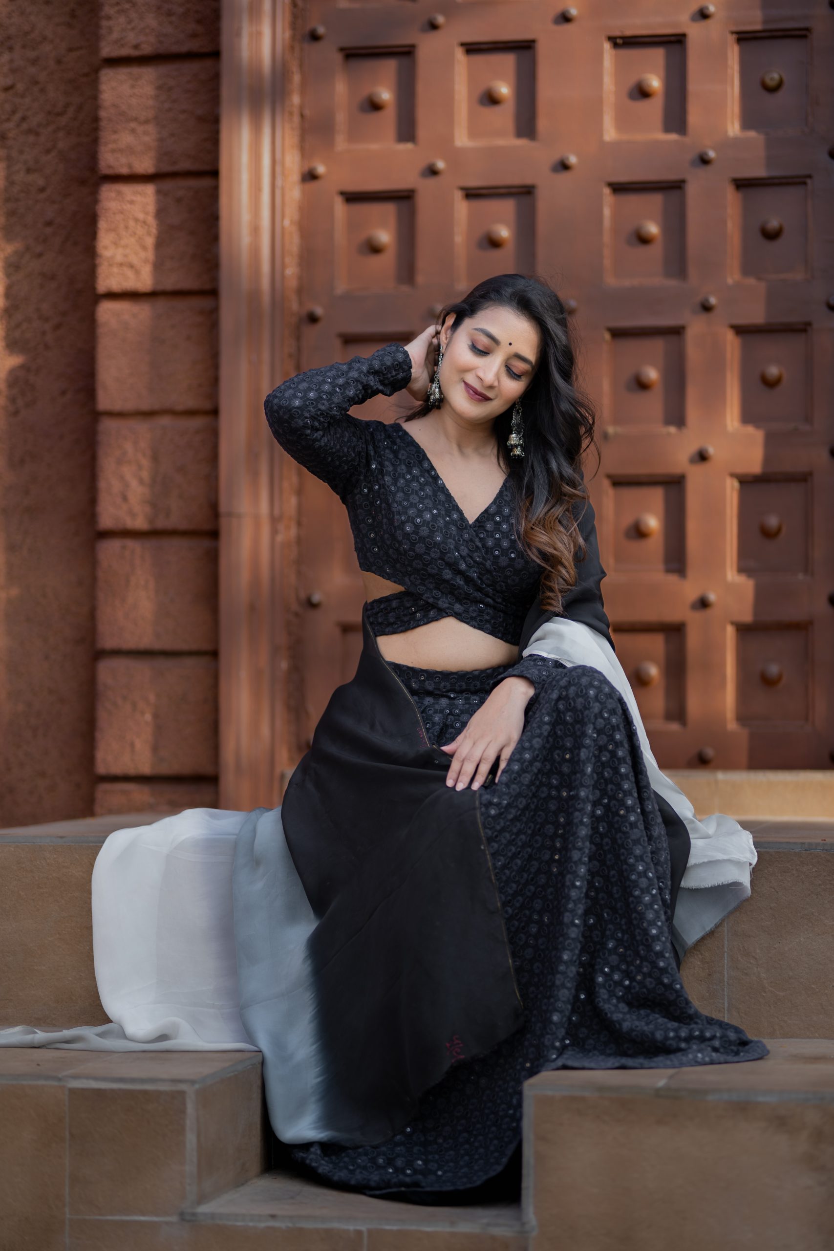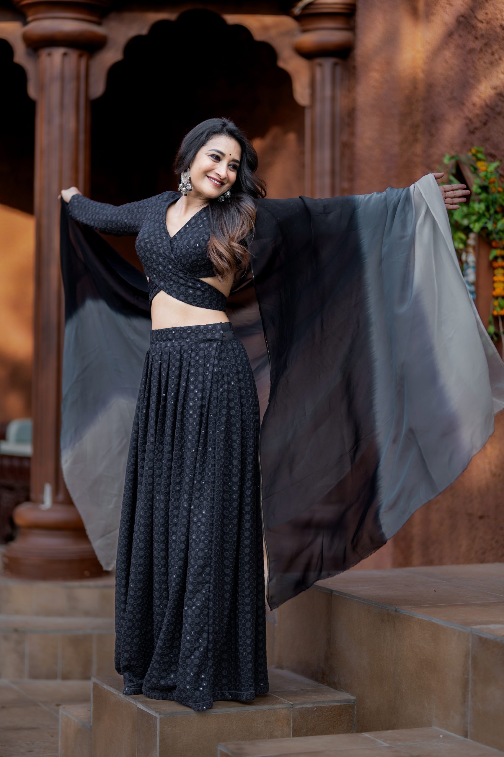 This elegant black Chikankari lehenga is paired with a soft organza dupatta in shades of black and grey, creating a stunning contrast. The beautifully crafted blouse features delicate details that enhance its charm, making this ensemble a perfect blend of tradition and modern grace — ideal for festive occasions, parties, or evening celebrations.