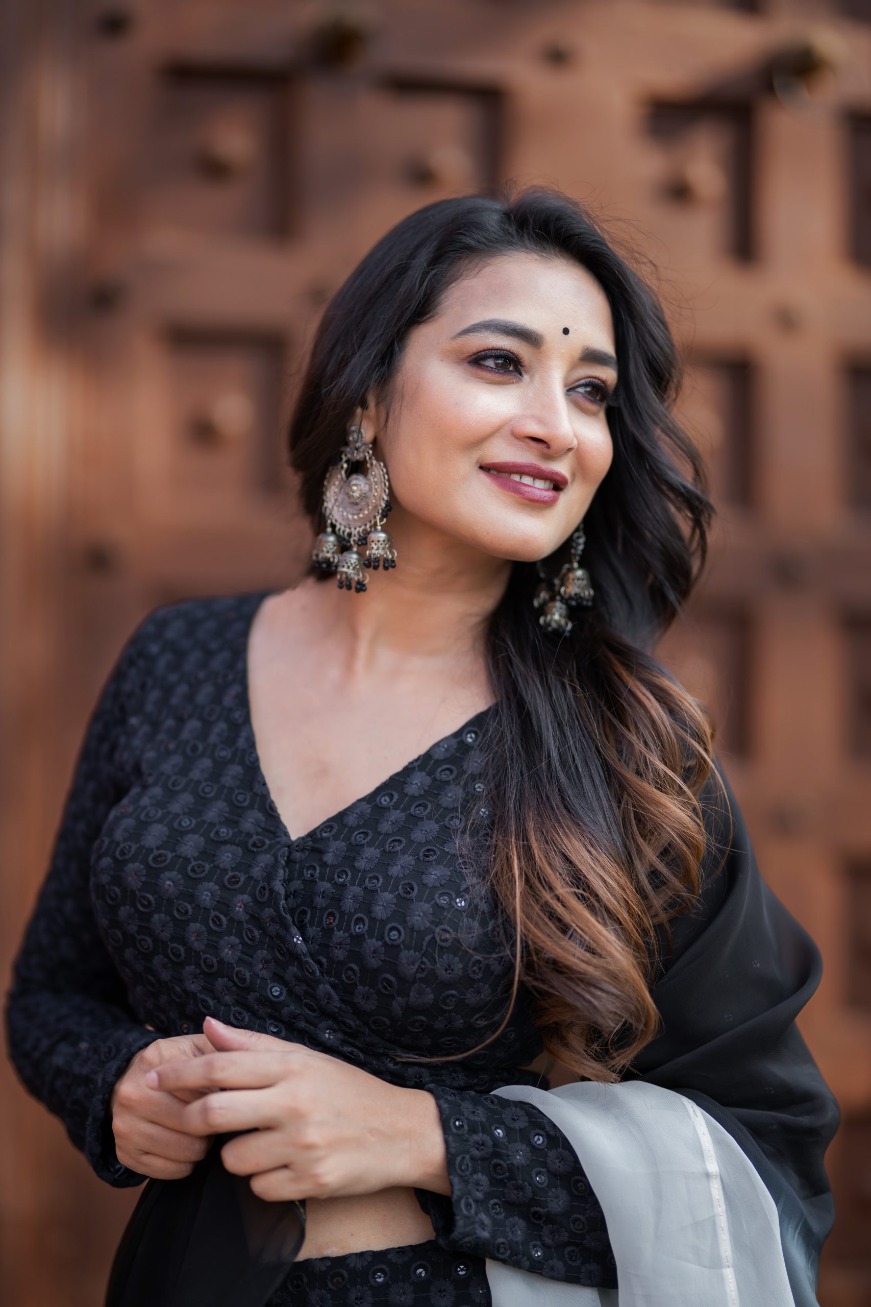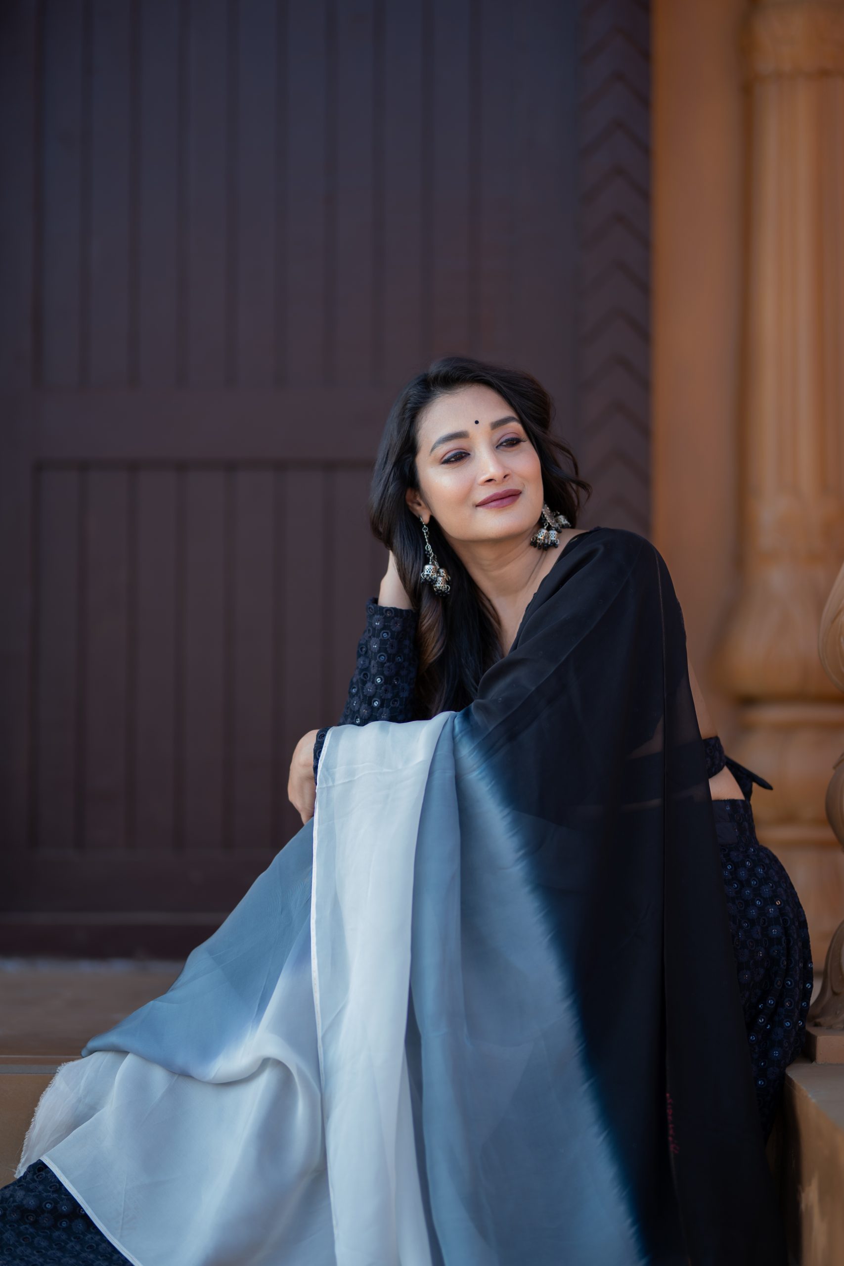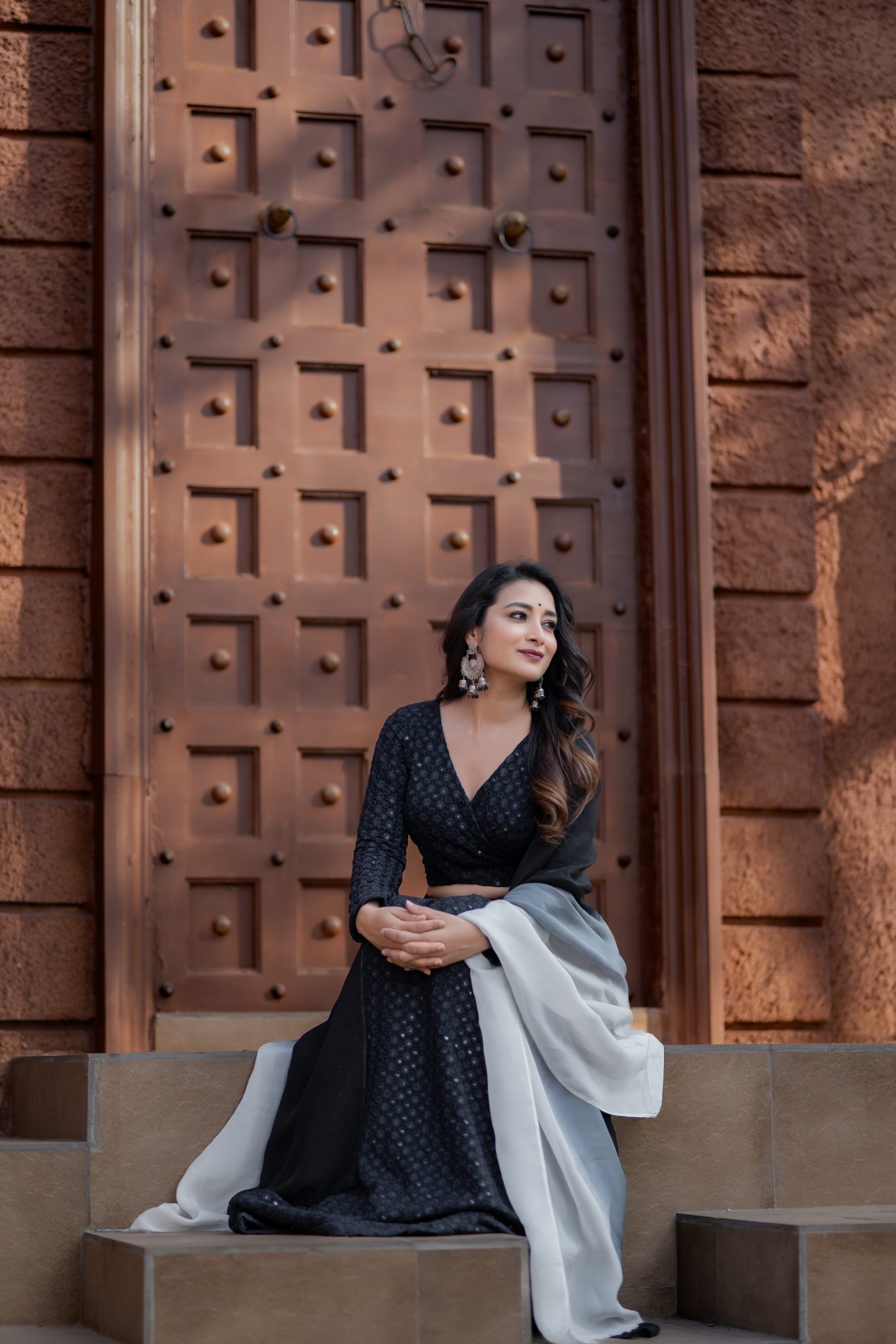 This elegant black Chikankari lehenga is paired with a soft organza dupatta in shades of black and grey, creating a stunning contrast. The beautifully crafted blouse features delicate details that enhance its charm, making this ensemble a perfect blend of tradition and modern grace — ideal for festive occasions, parties, or evening celebrations.