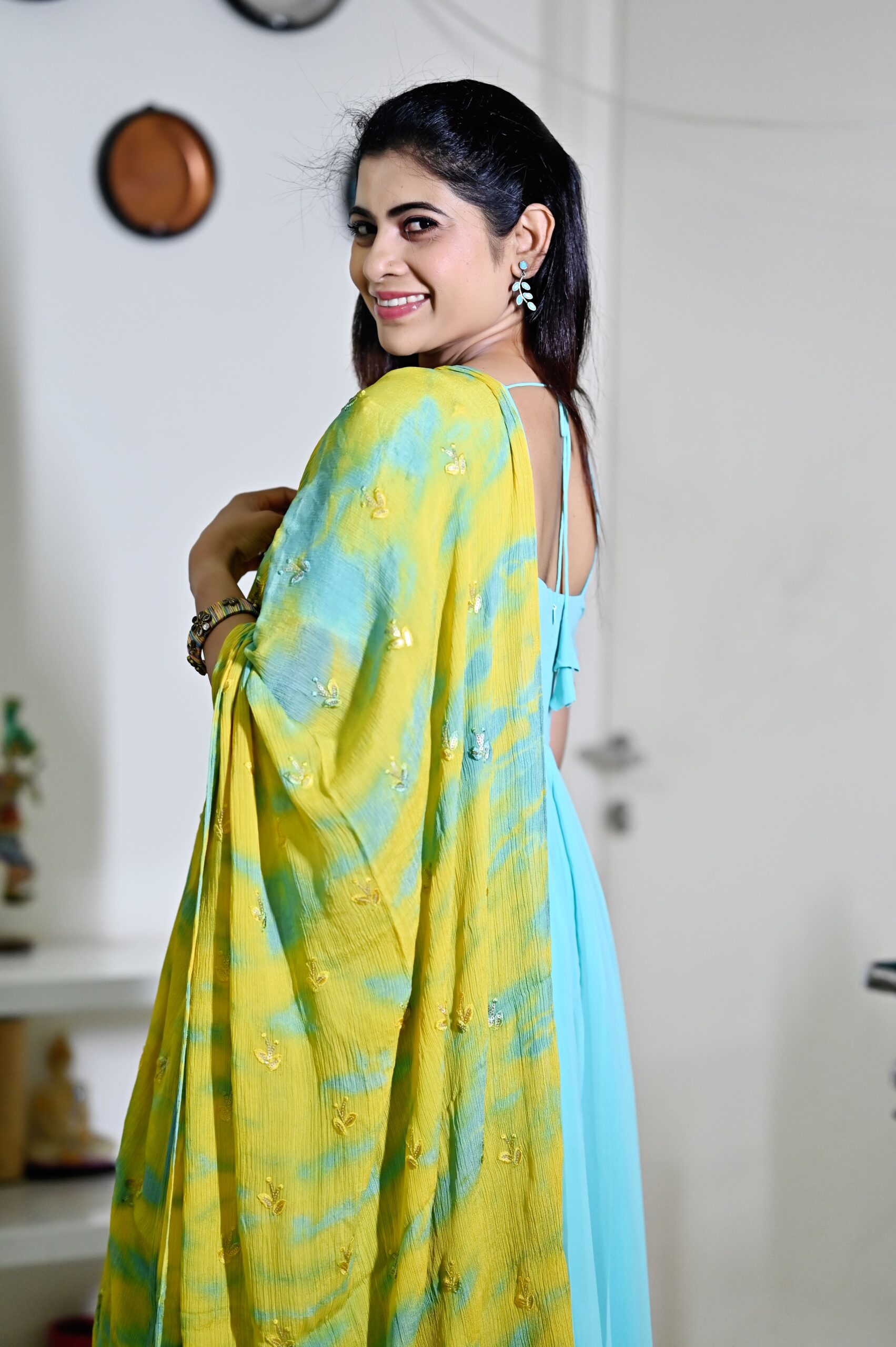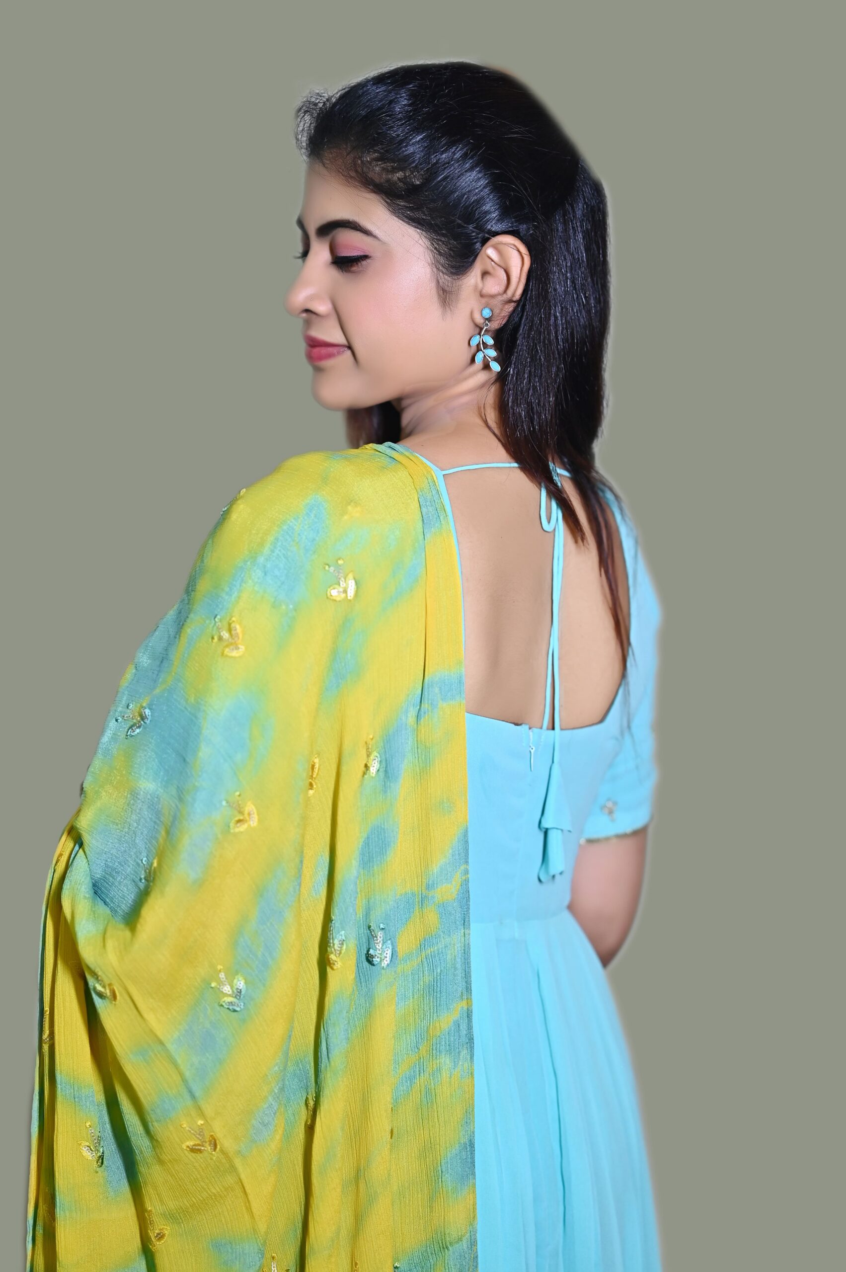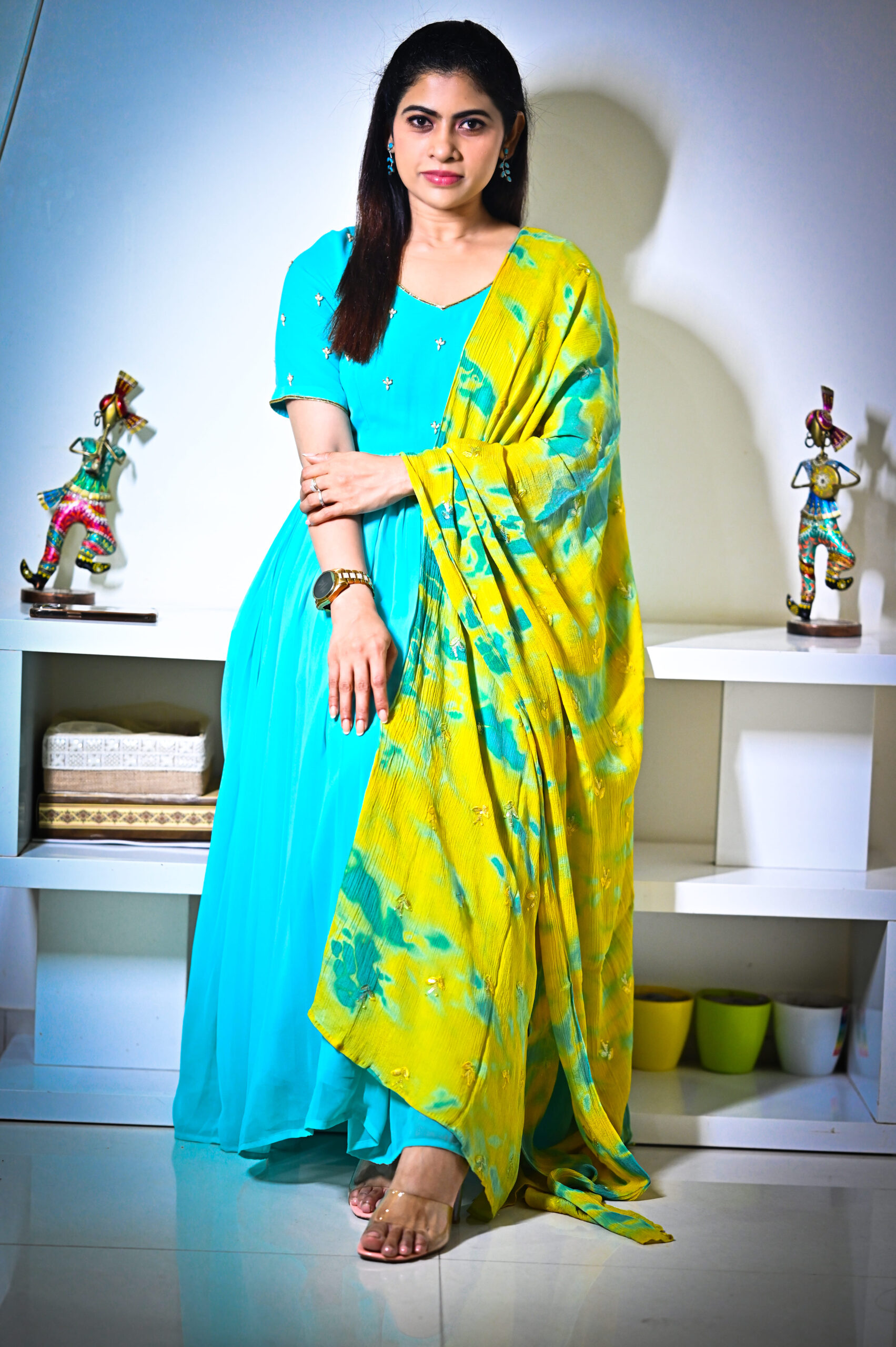 This elegant blue georgette dress exudes subtle charm with its delicate maggam embroidery accents. Paired with a beautifully dyed chinnon dupatta in soft hues, the ensemble blends grace with modern flair. Lightweight and flowy, it’s a perfect choice for festive occasions, family gatherings, or semi-formal celebrations.