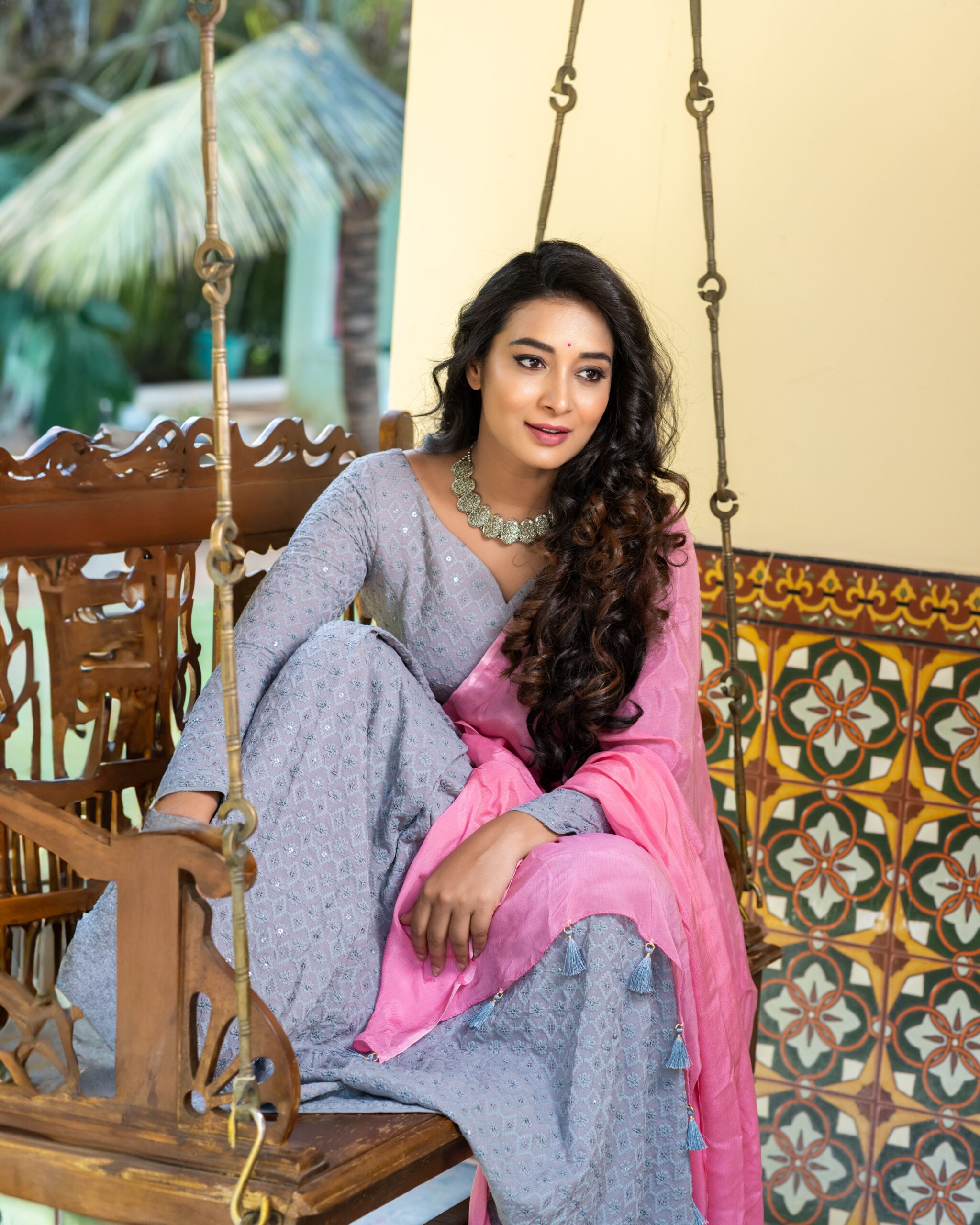 This elegant set is a cotton Chikankari lehenga in a soothing grey color. The cotton fabric offers a comfortable and easy-to-wear drape, gracefully adorned with delicate, traditional Lucknowi threadwork. The look is completed by a striking Chinon pink dupatta, which, with its characteristic flow and slight texture, creates a beautiful balance between the subtle work and vibrant color, making it perfect for daytime celebrations.