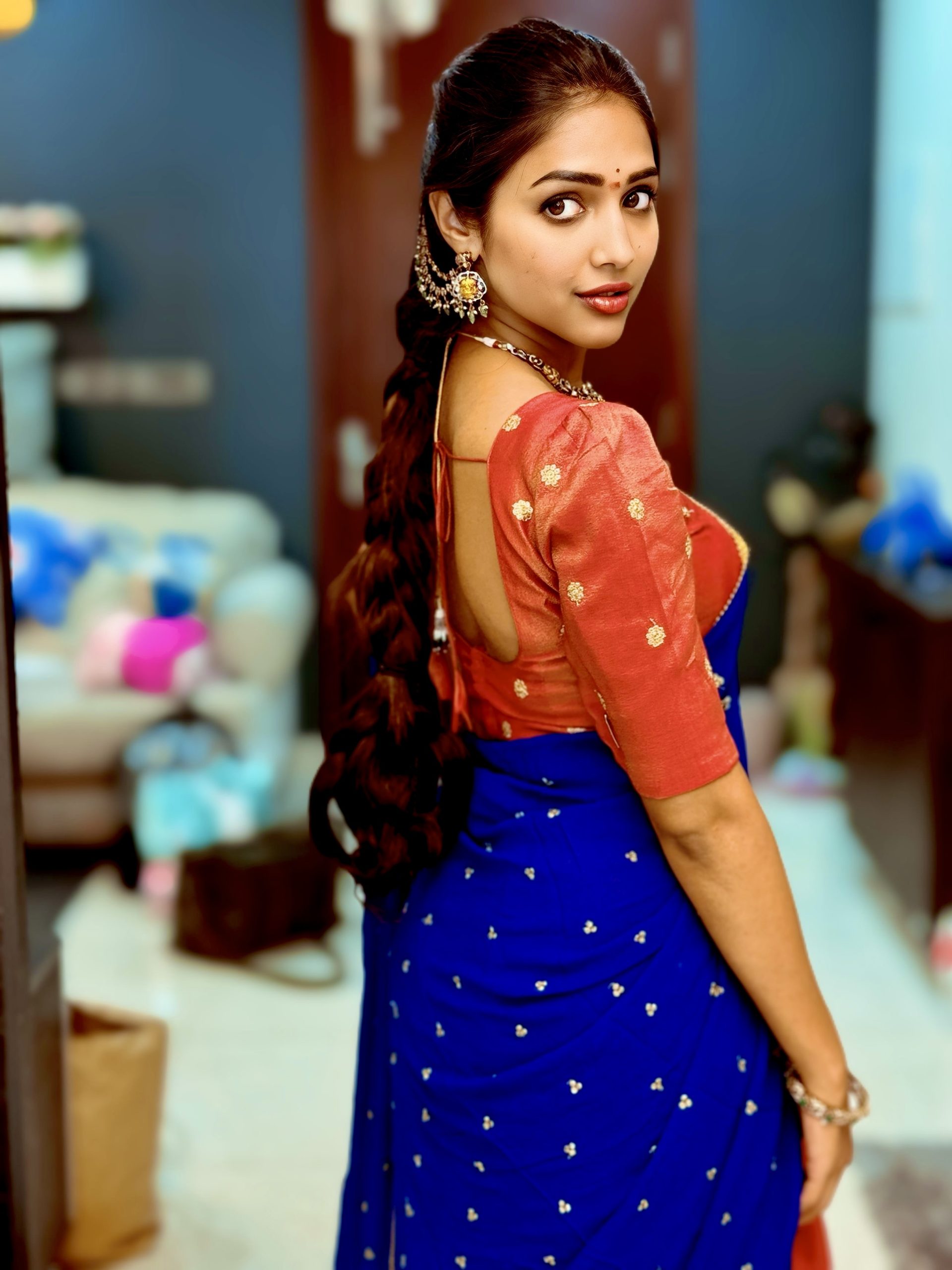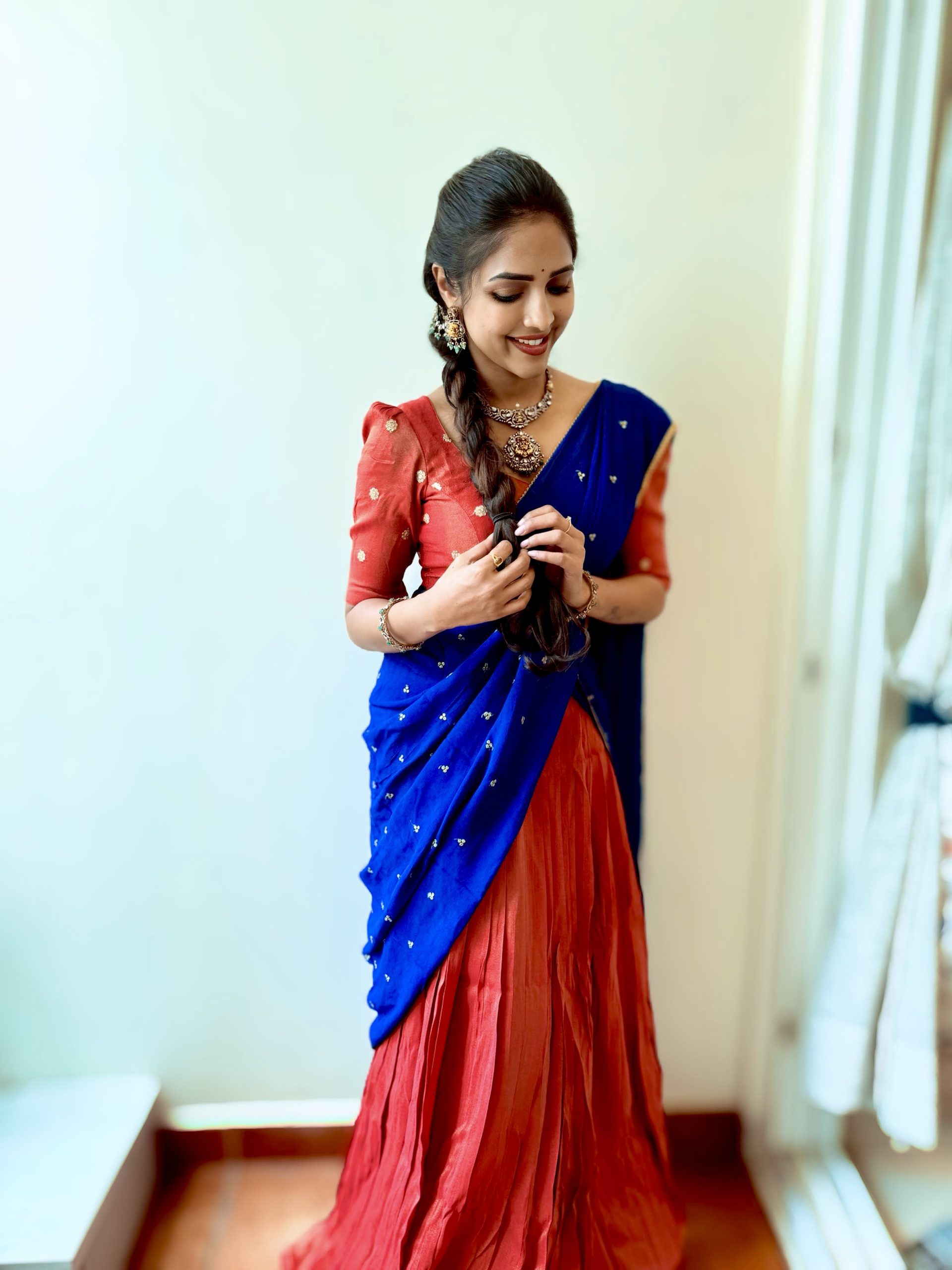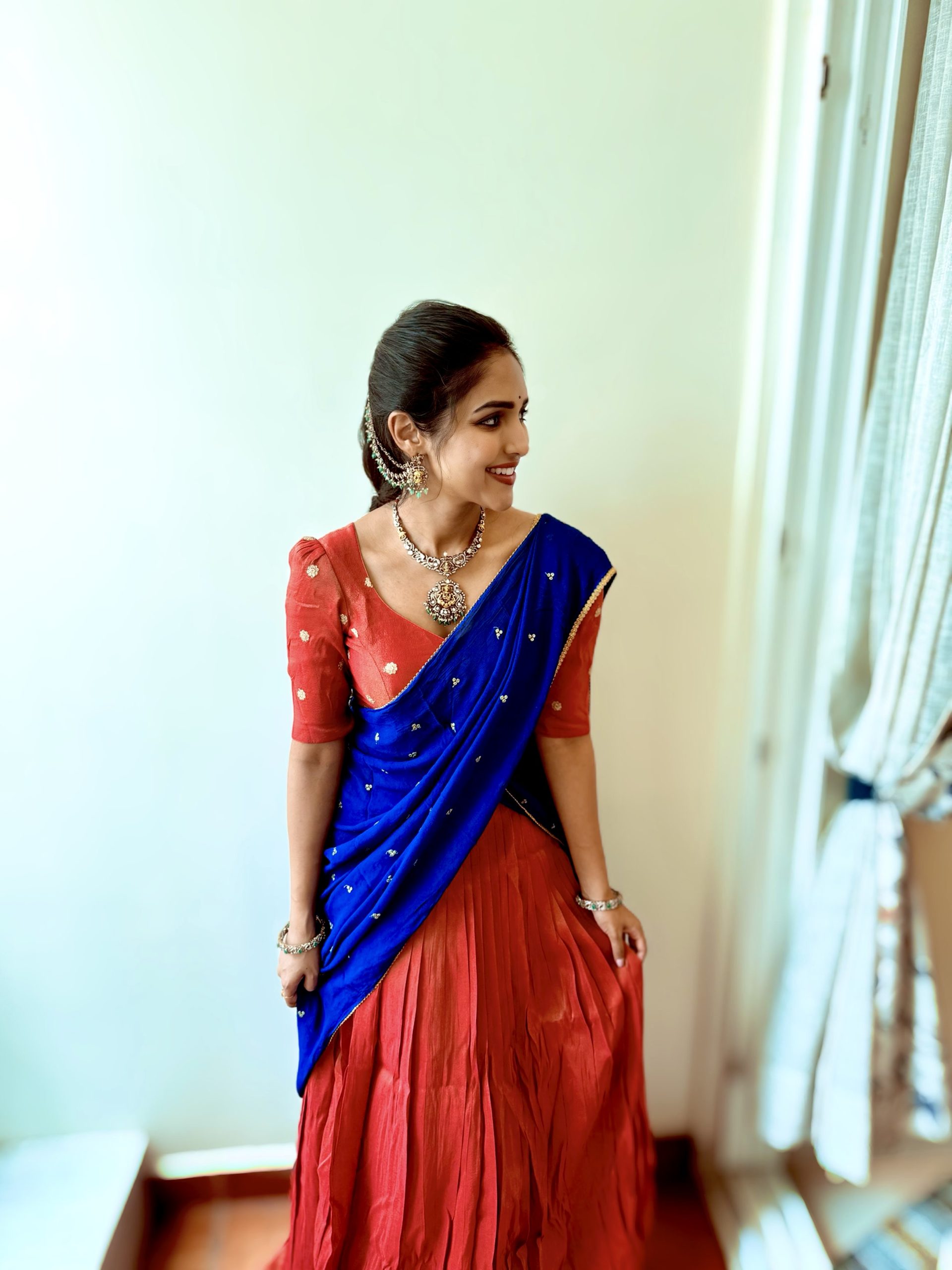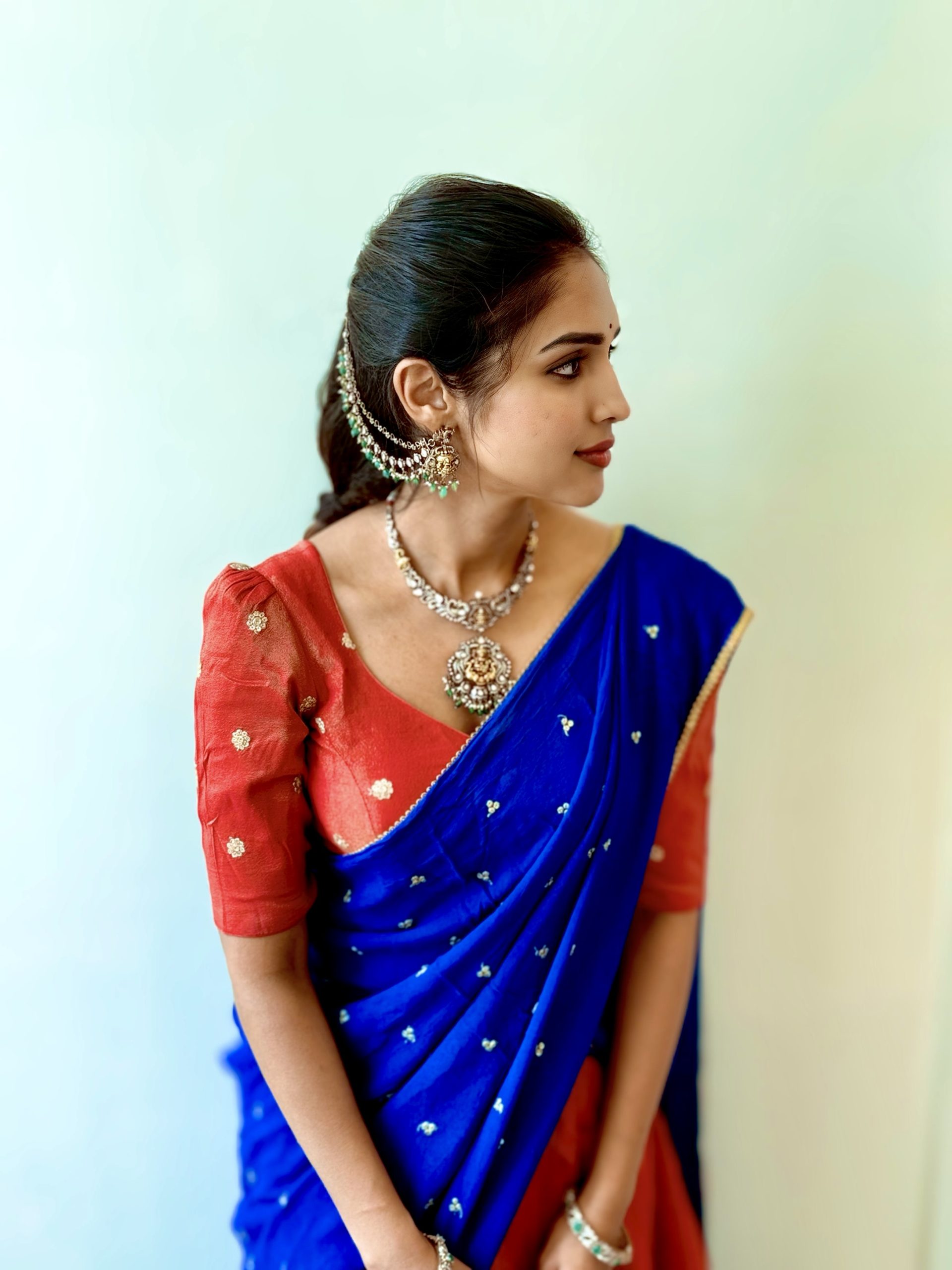 This exquisite pure shimmer lehenga radiates natural elegance, crafted with naturally dyed fabric for a subtle, rich glow. Paired with a pure crepe blue dupatta that adds a luxurious contrast, the outfit features a beautifully detailed blouse adorned with sequin buttie motifs — blending traditional artistry with modern sophistication.