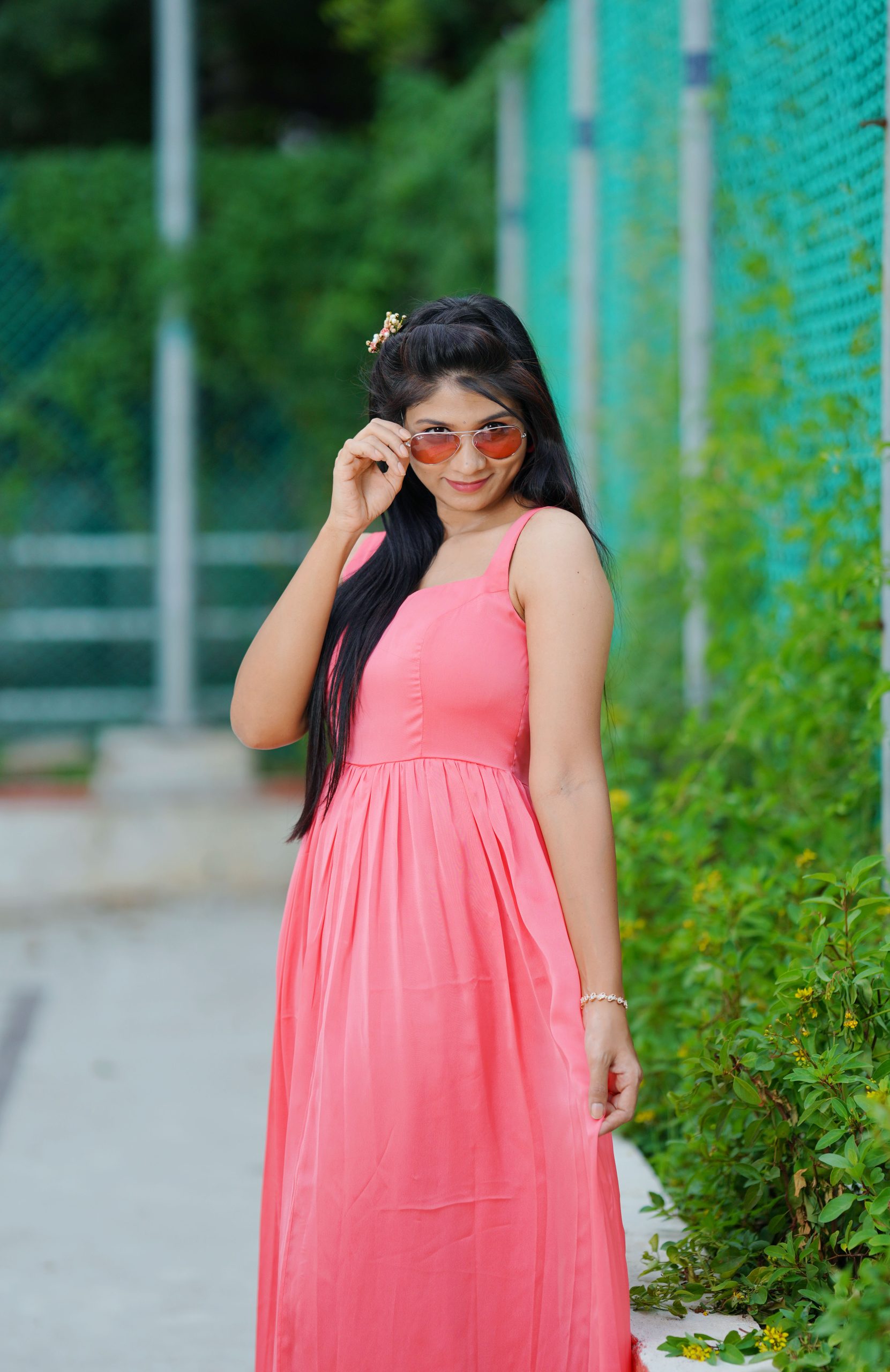 A graceful coral pink gown crafted from soft, flowy fabric featuring delicate ruffle detailing at the hem. Designed with slender straps and a flattering silhouette, this outfit perfectly blends comfort and charm — ideal for casual outings or evening gatherings.