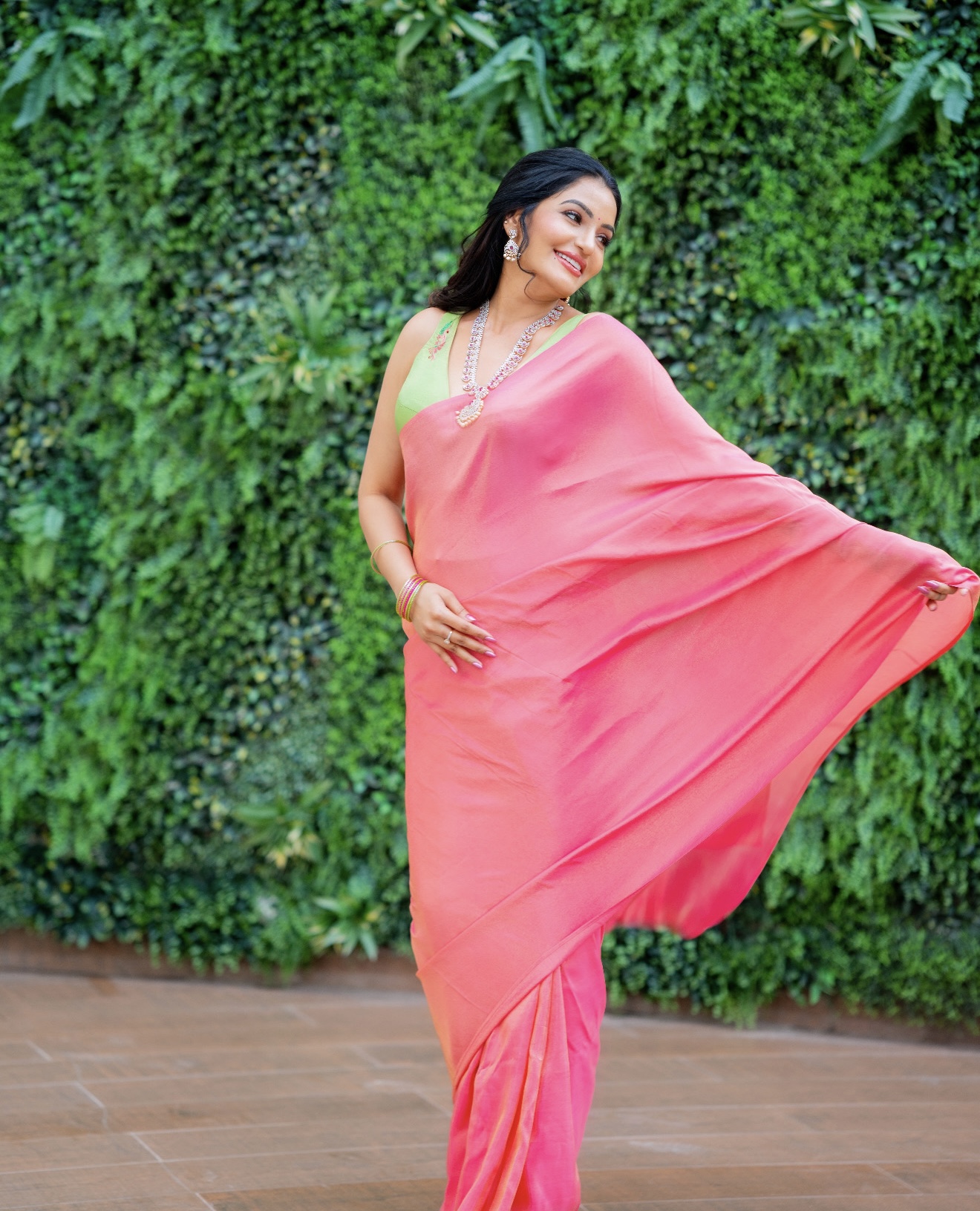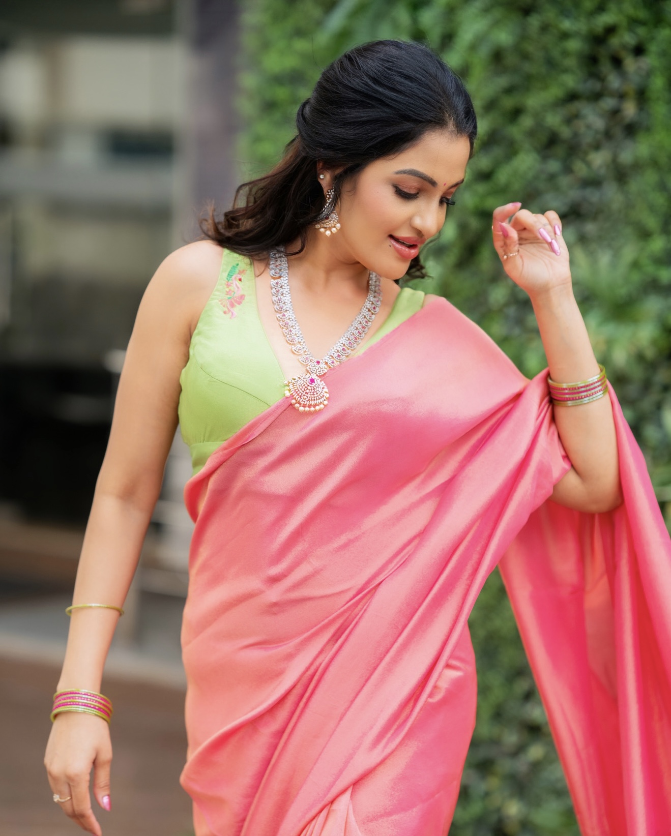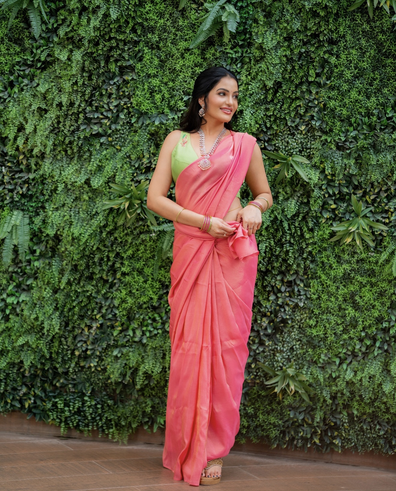 This elegant golden shimmer saree radiates a soft, luxurious glow, perfect for festive occasions or evening celebrations. Paired with a stunning green-golden shimmer blouse, it features intricate embroidery on the shoulders, adding a graceful charm to the ensemble. The subtle sheen of the fabric and delicate detailing make this saree a timeless blend of sophistication and style.