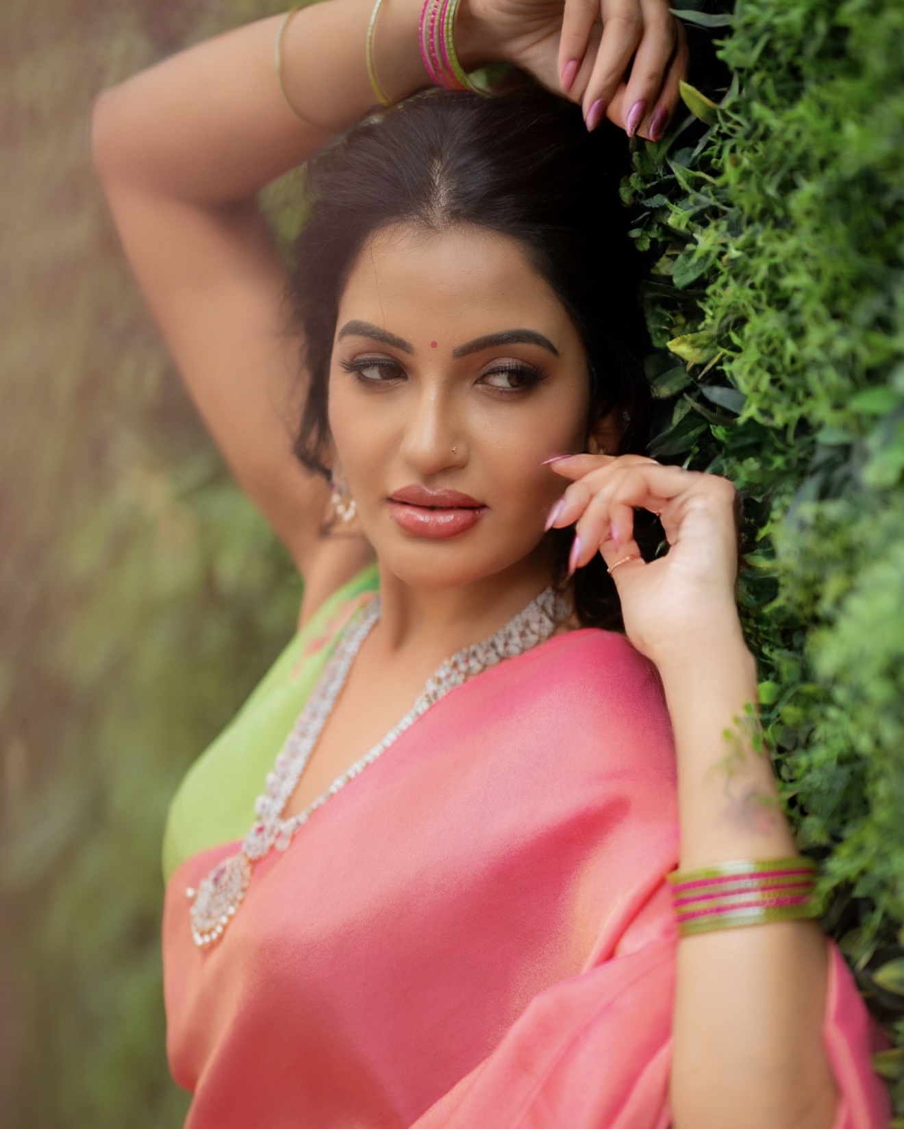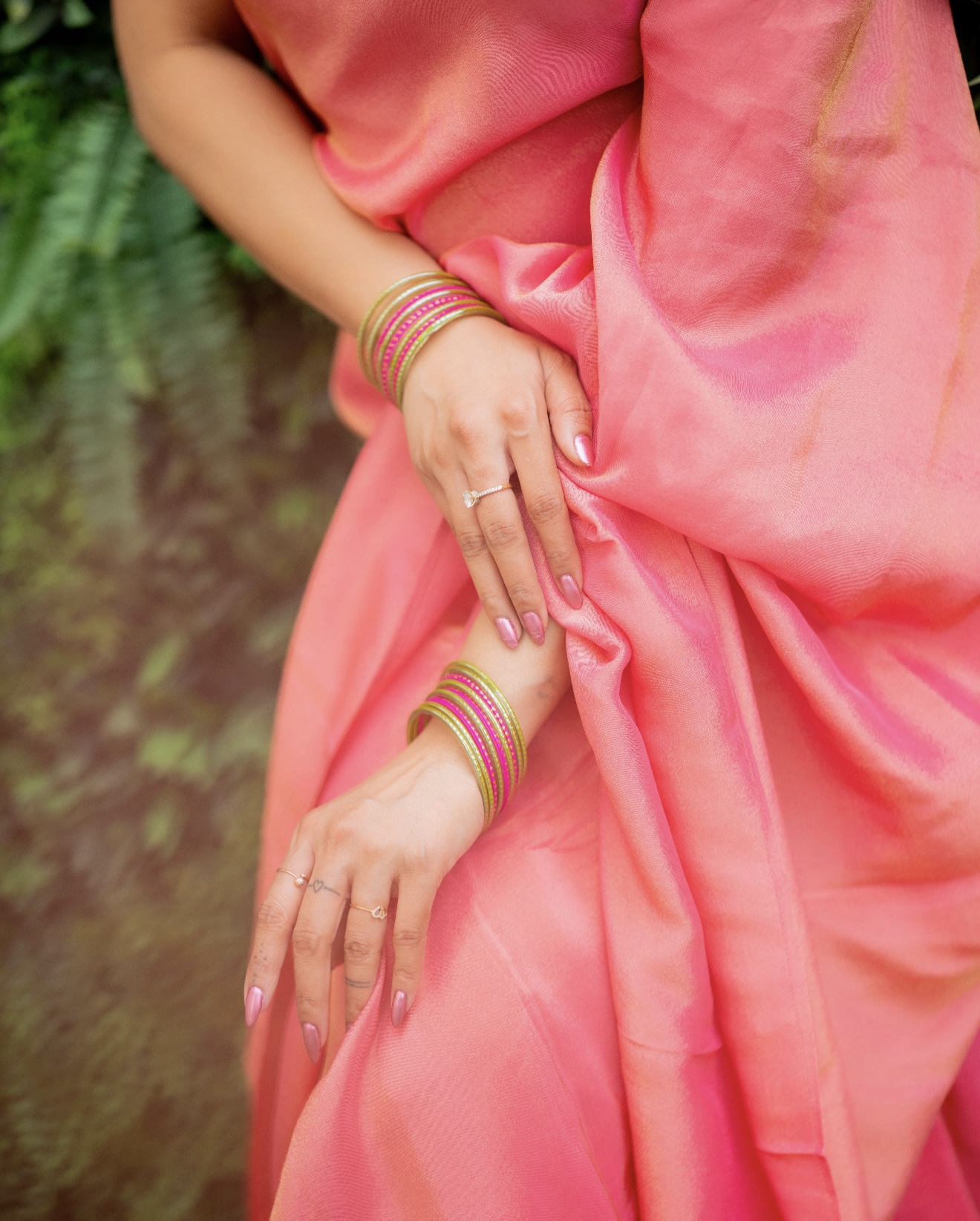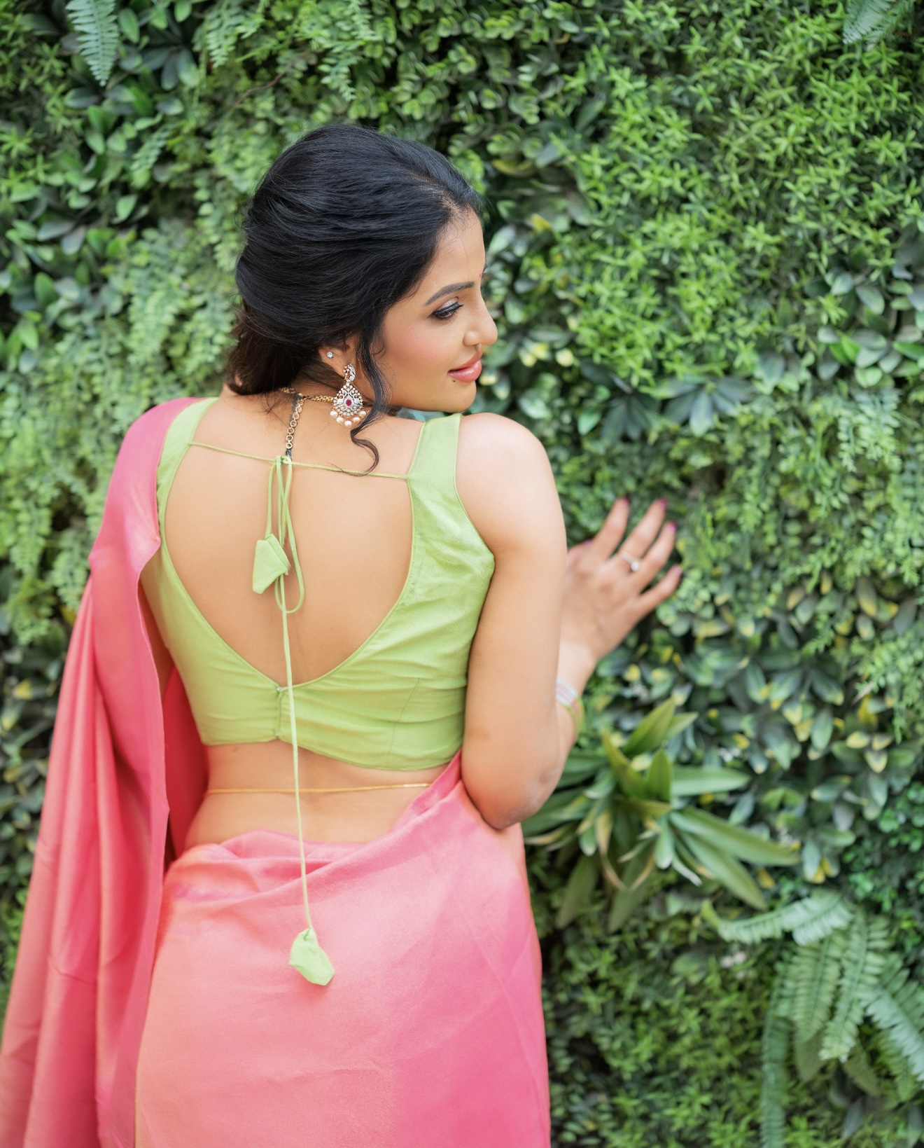 This elegant golden shimmer saree radiates a soft, luxurious glow, perfect for festive occasions or evening celebrations. Paired with a stunning green-golden shimmer blouse, it features intricate embroidery on the shoulders, adding a graceful charm to the ensemble. The subtle sheen of the fabric and delicate detailing make this saree a timeless blend of sophistication and style.