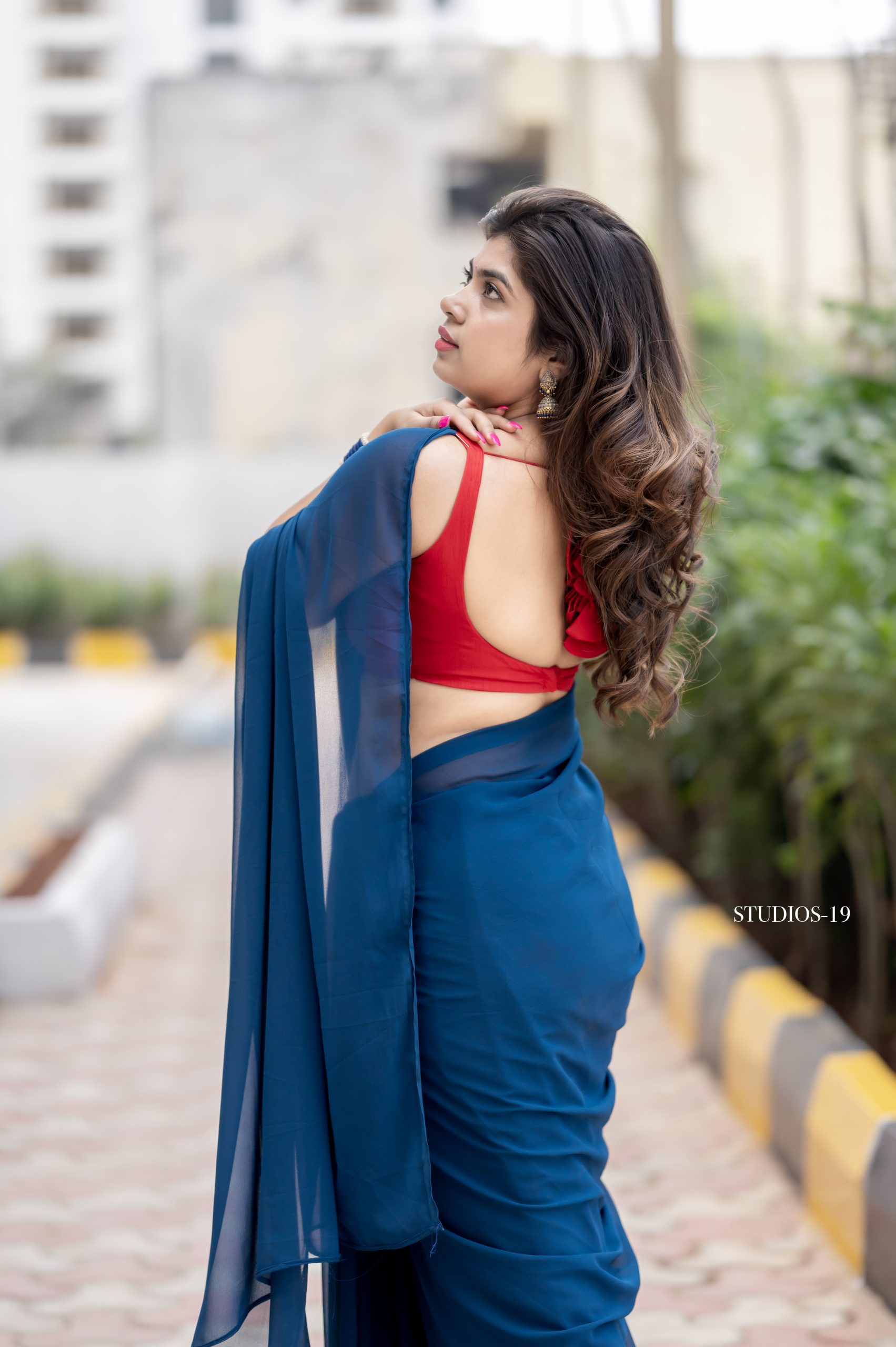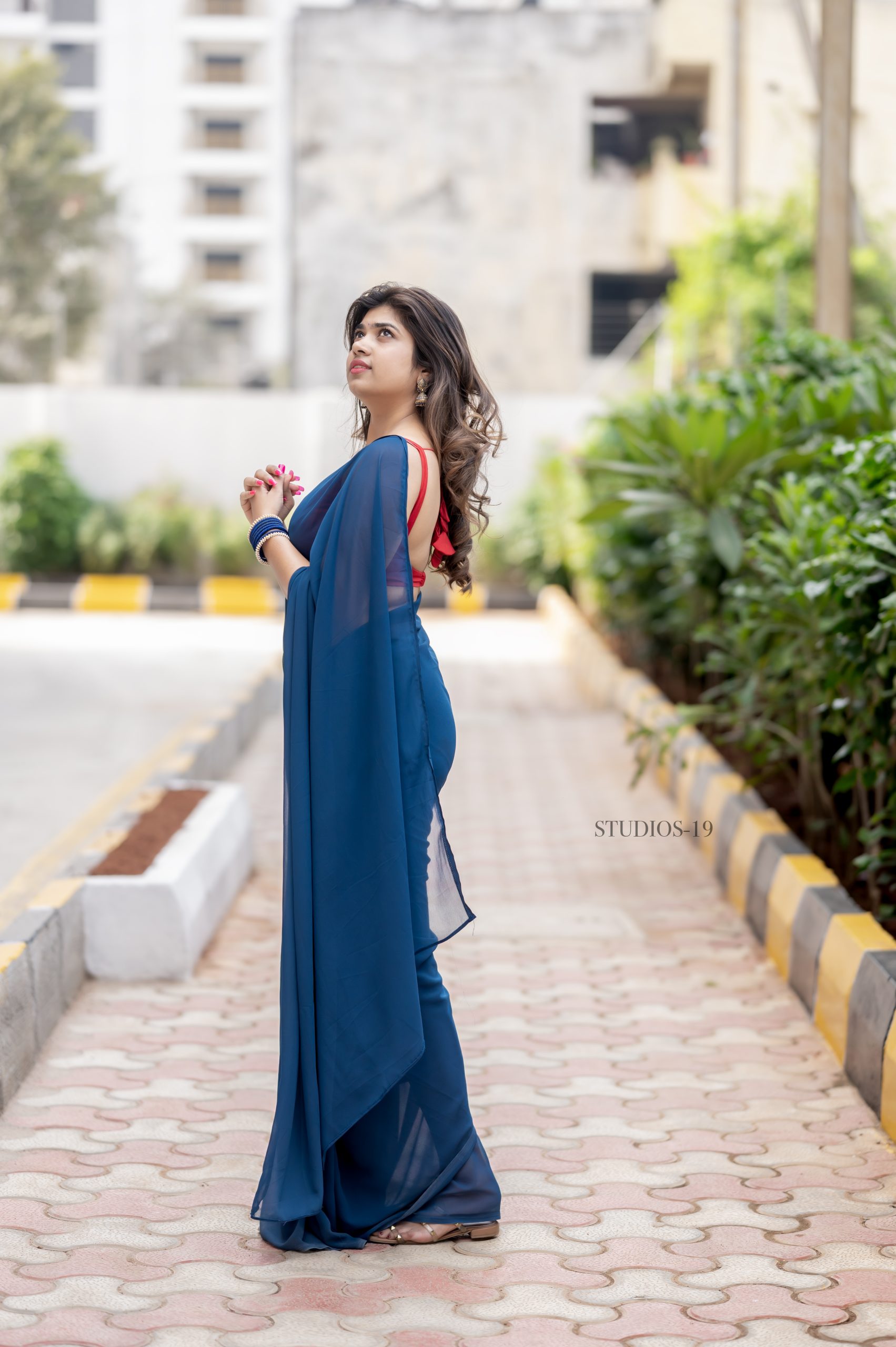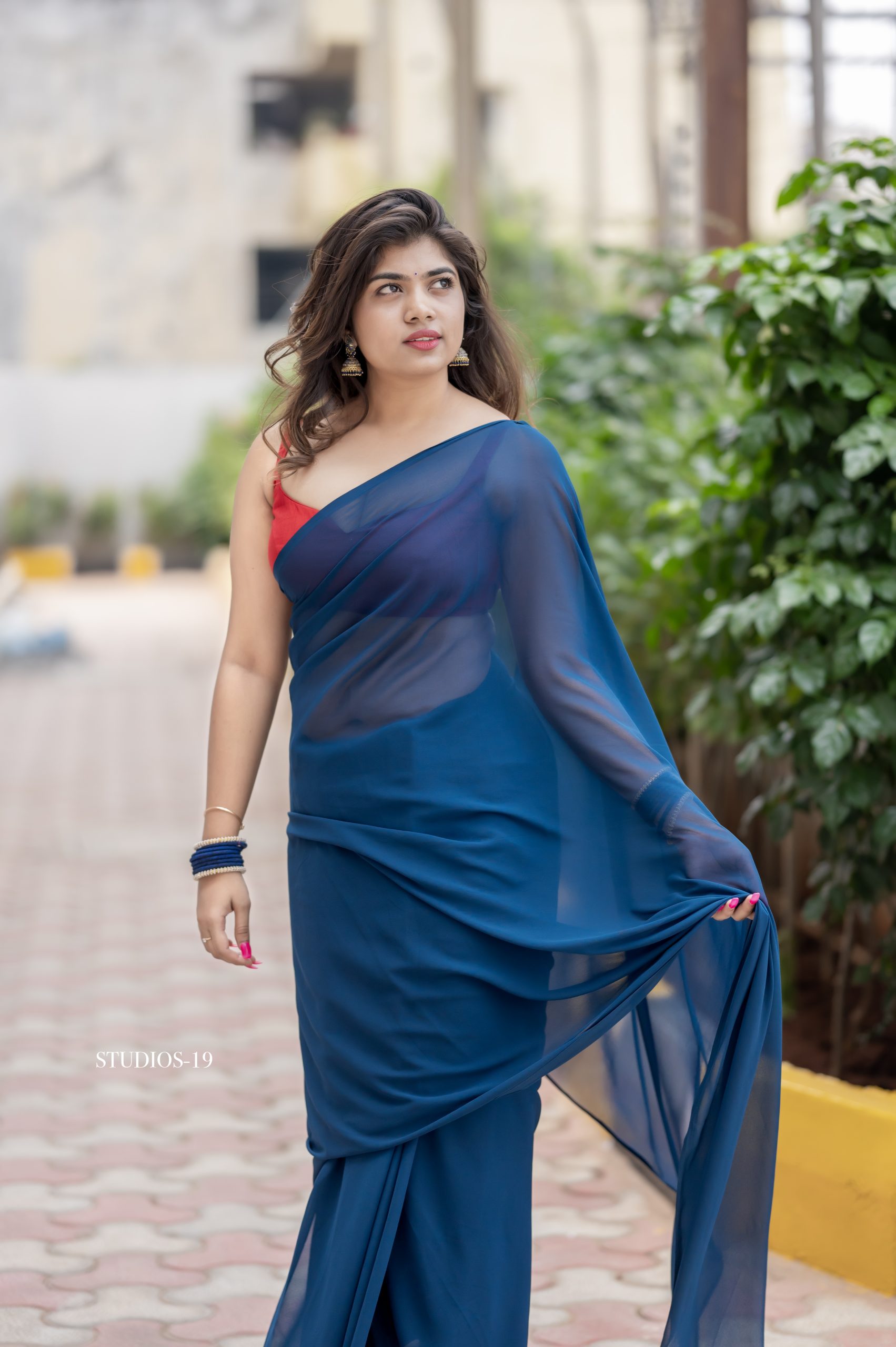 A beautiful blue georgette saree paired with a contrast red blouse. Light, elegant, and perfect for any special occasion.