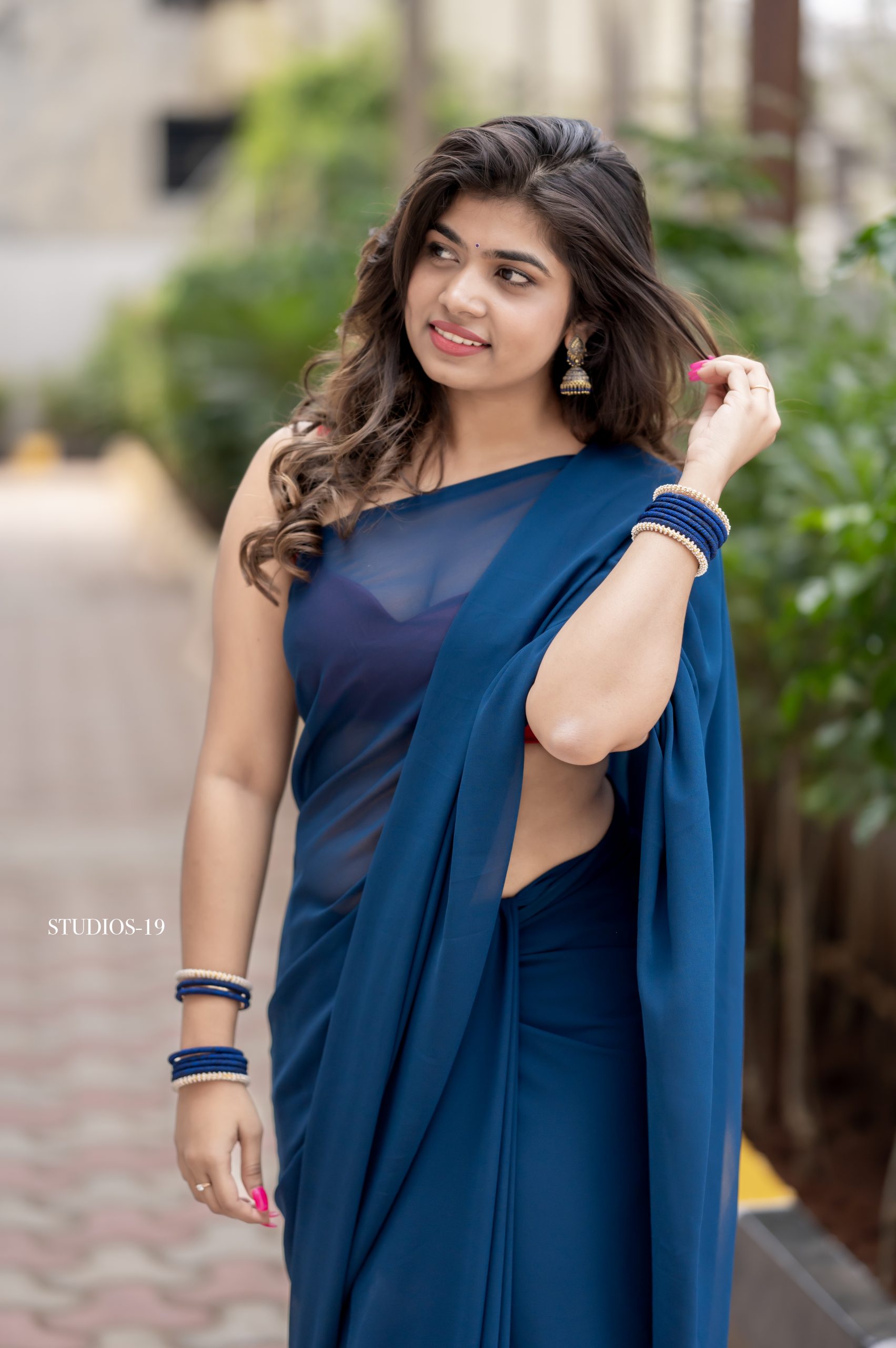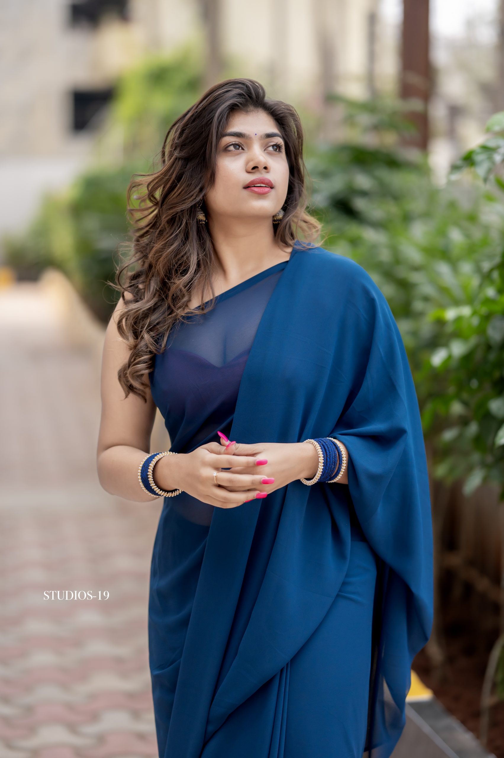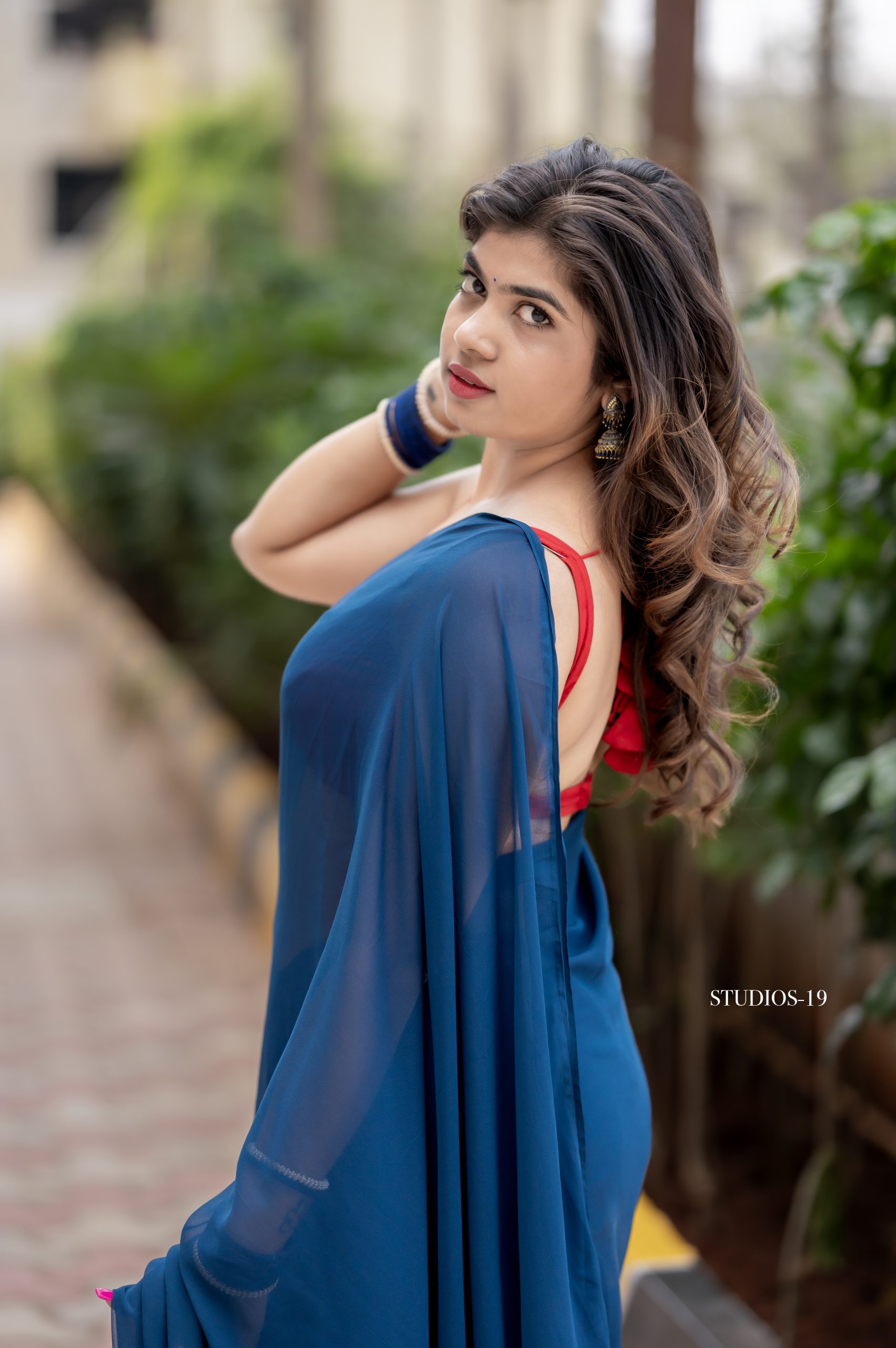 A beautiful blue georgette saree paired with a contrast red blouse. Light, elegant, and perfect for any special occasion.