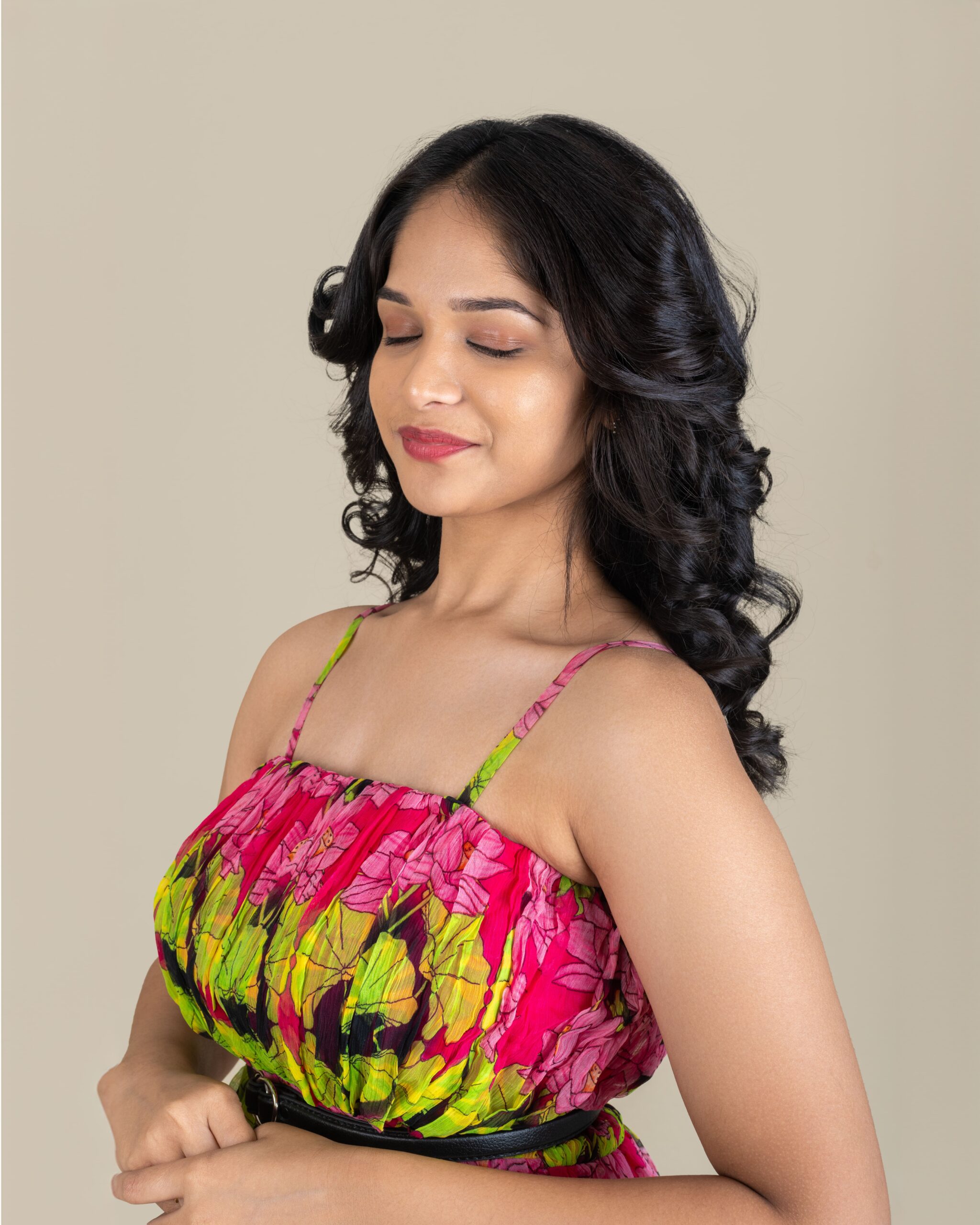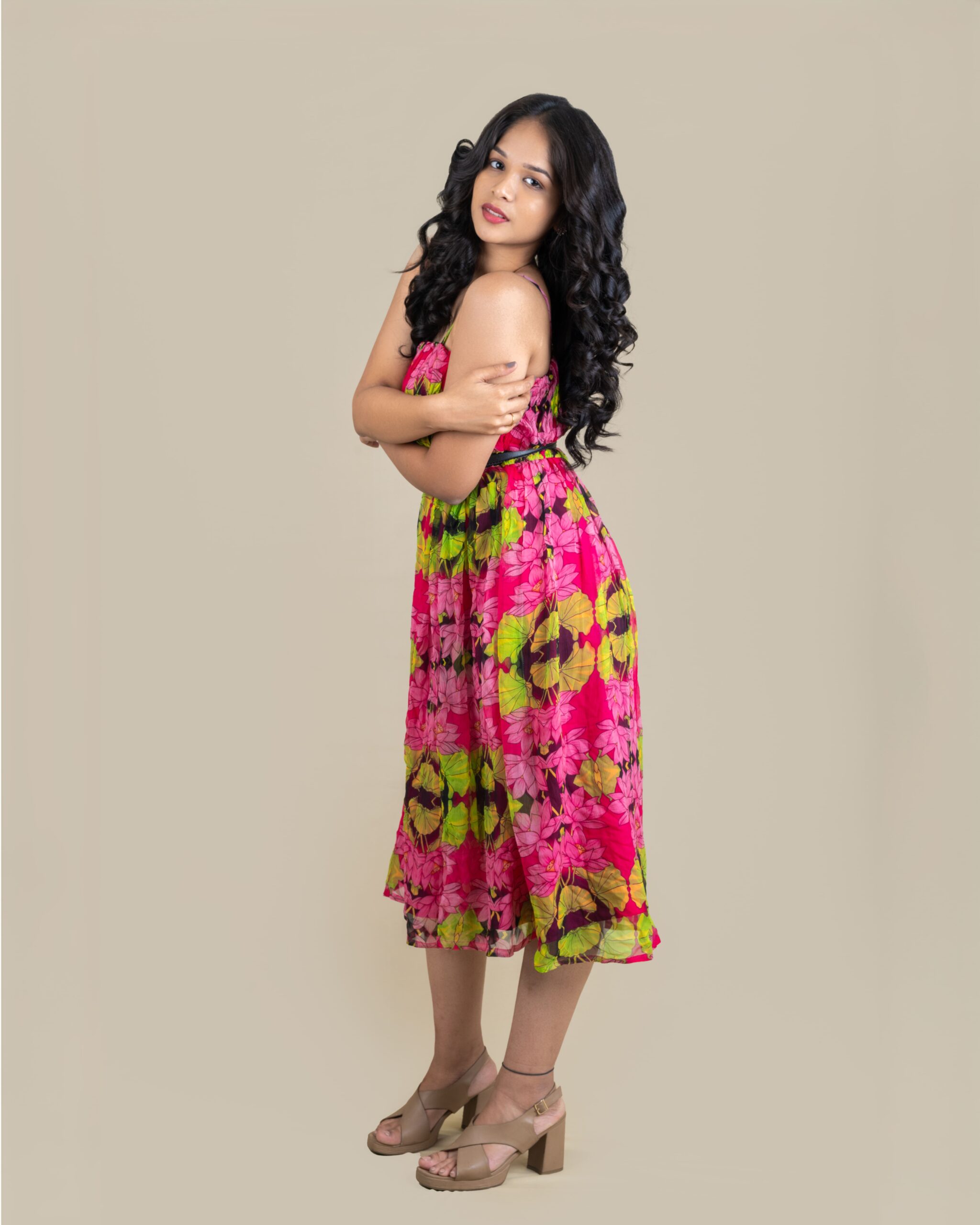 This multicolour printed strap dress is a perfect blend of comfort and vibrant style. Designed with bold lotus floral patterns in shades of pink, yellow, and green, it adds a lively touch to your look. Made from lightweight and breathable fabric, this dress is ideal for casual outings, vacations, or brunch dates. Its sleeveless design and flowy silhouette make it both stylish and comfortable, giving you an effortlessly chic appearance wherever you go.