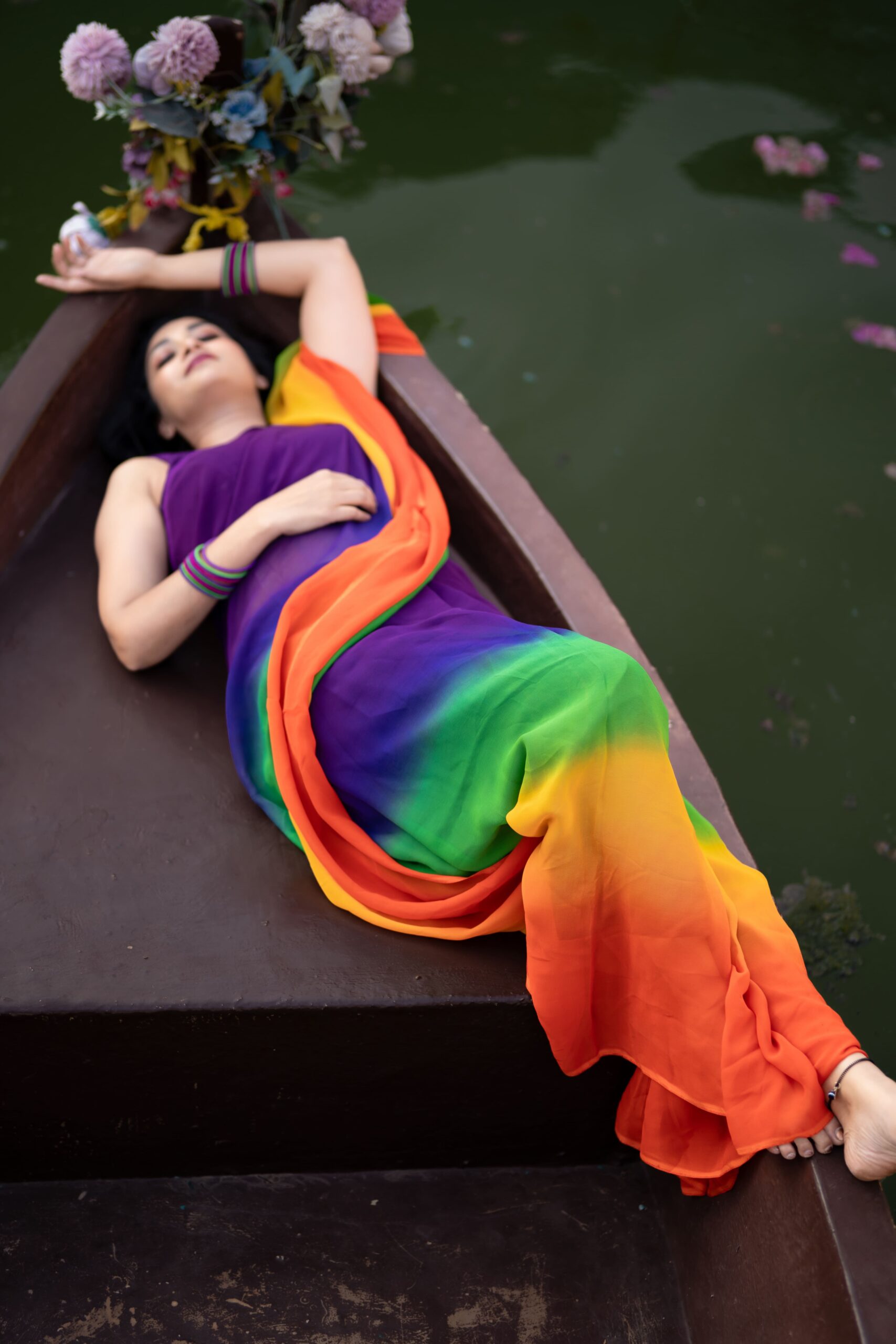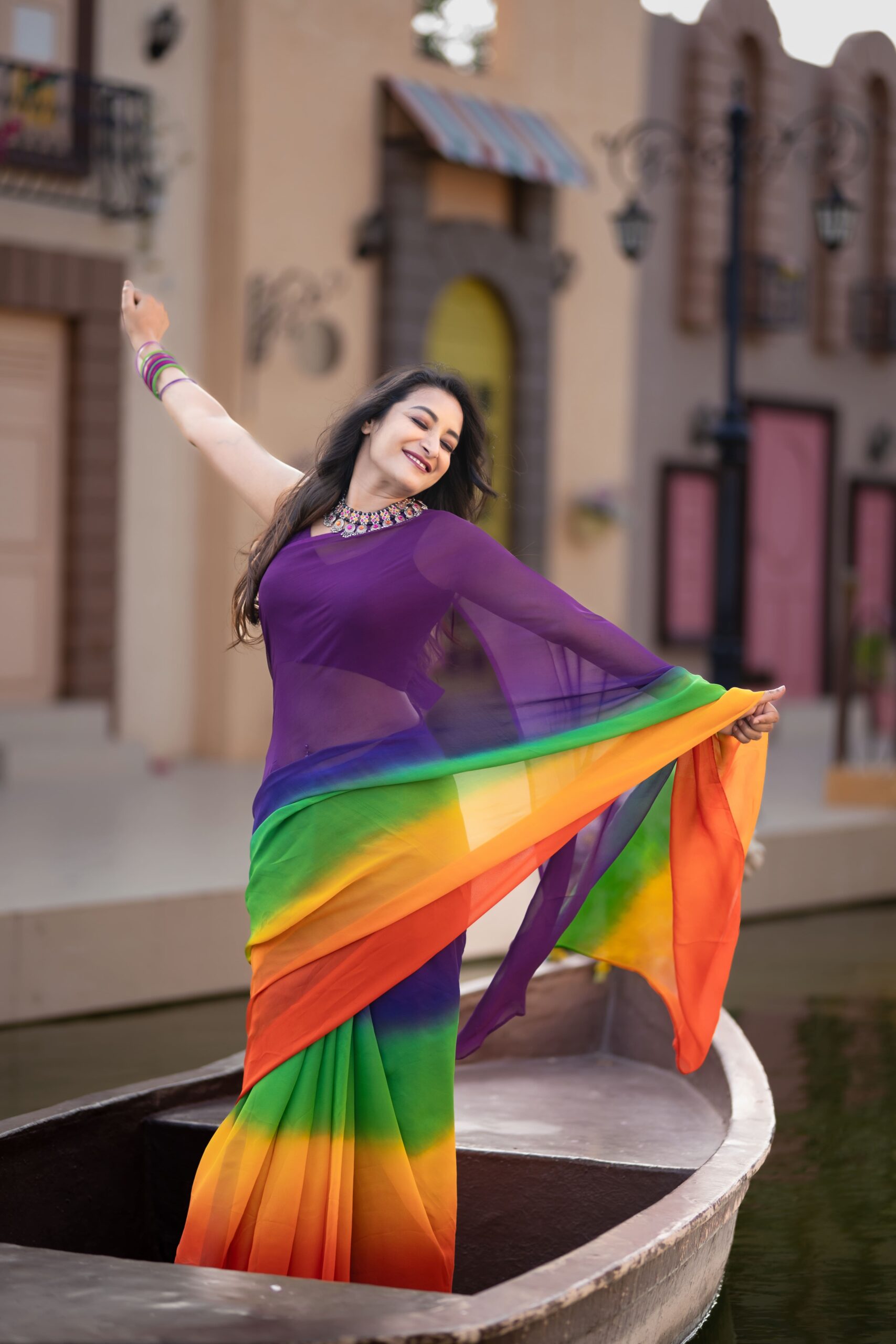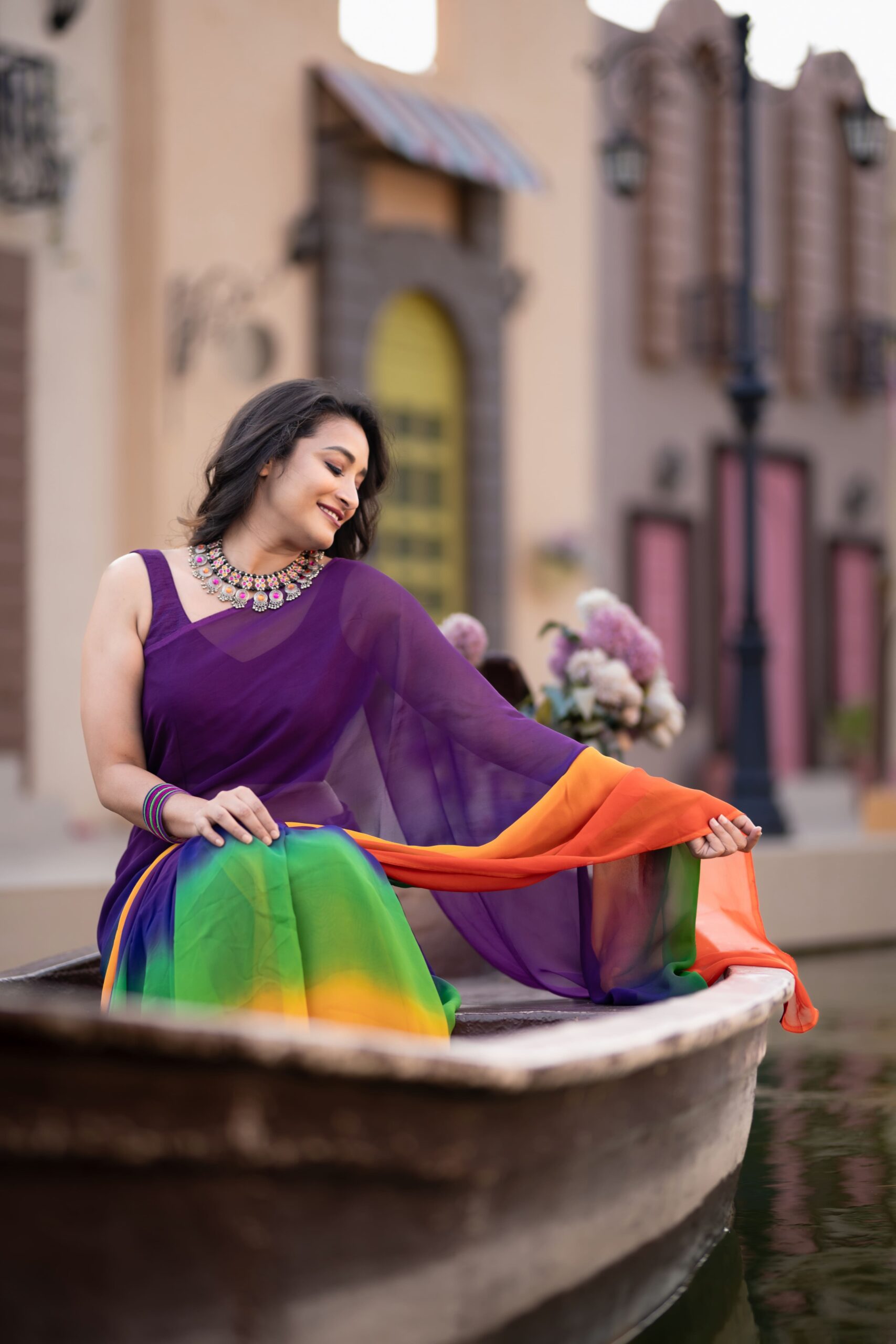 Radiate vibrance with this exquisite pure georgette saree, inspired by the hues of a rainbow. Its fluid drape and soft texture flow gracefully, while the vivid colors blend in perfect harmony to create a striking visual. Paired with a contrasting raw silk blouse, this ensemble exudes festive charm and modern allure — perfect for lively celebrations and elegant gatherings.