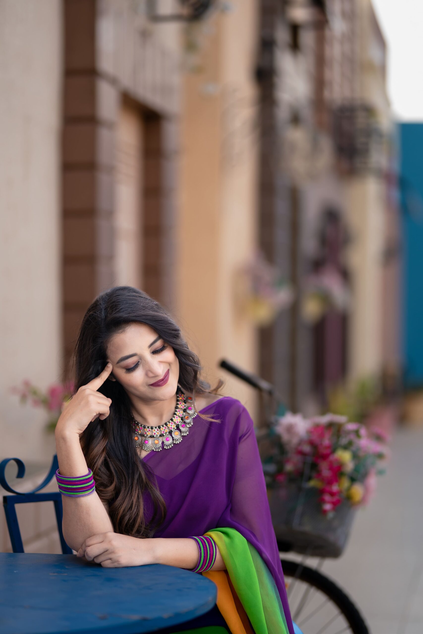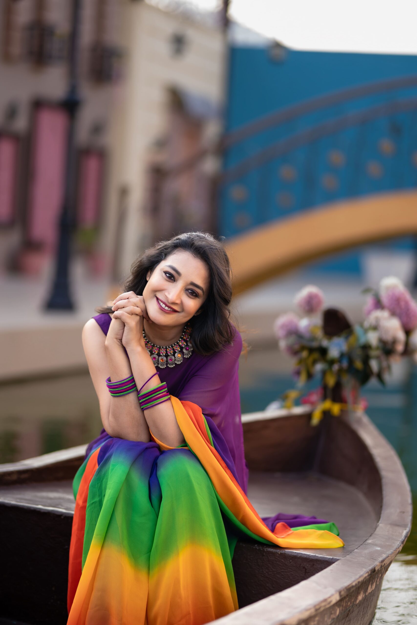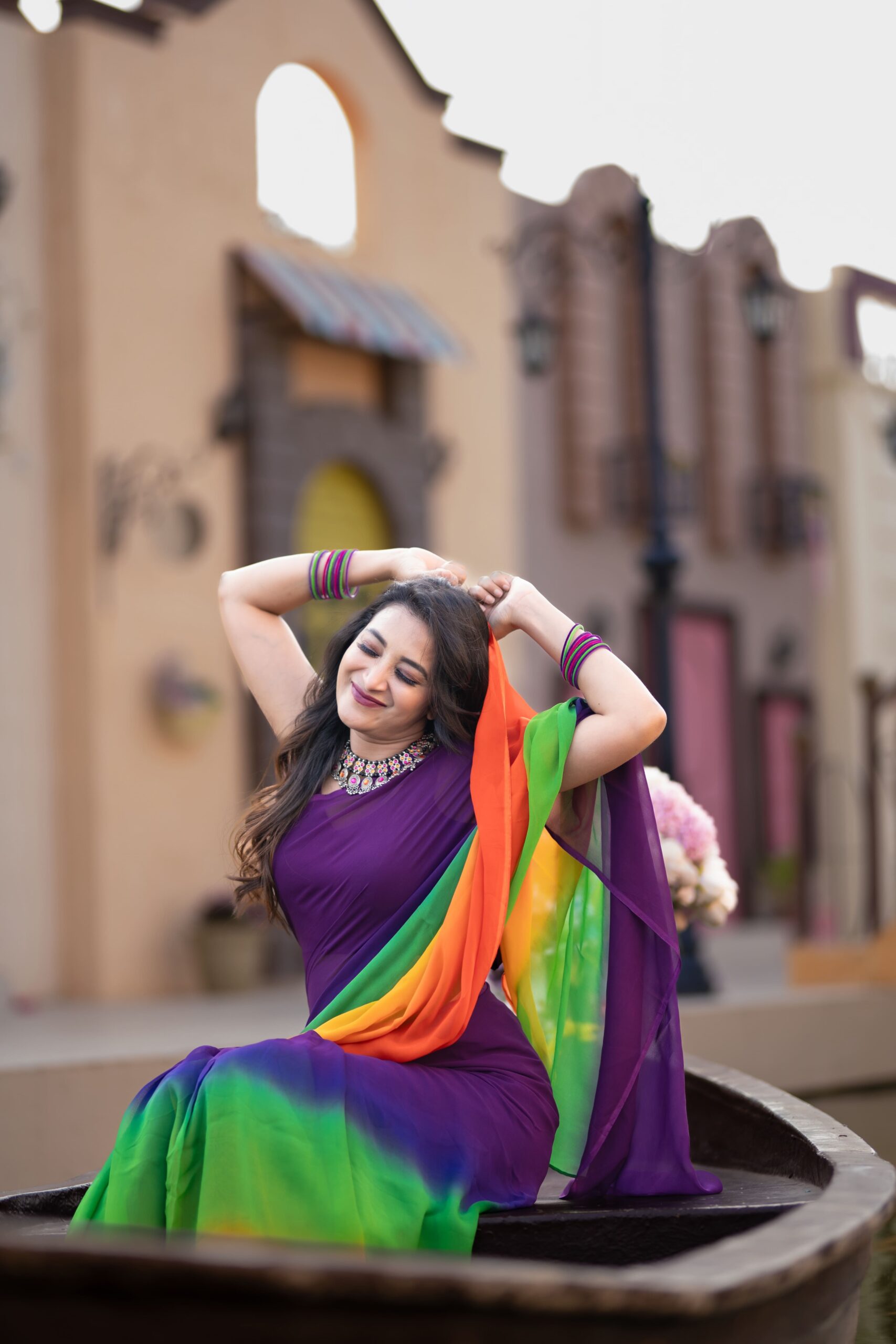 Radiate vibrance with this exquisite pure georgette saree, inspired by the hues of a rainbow. Its fluid drape and soft texture flow gracefully, while the vivid colors blend in perfect harmony to create a striking visual. Paired with a contrasting raw silk blouse, this ensemble exudes festive charm and modern allure — perfect for lively celebrations and elegant gatherings.