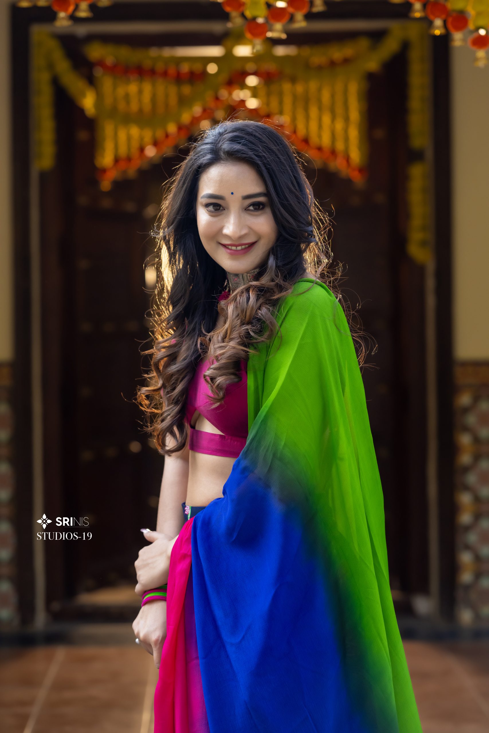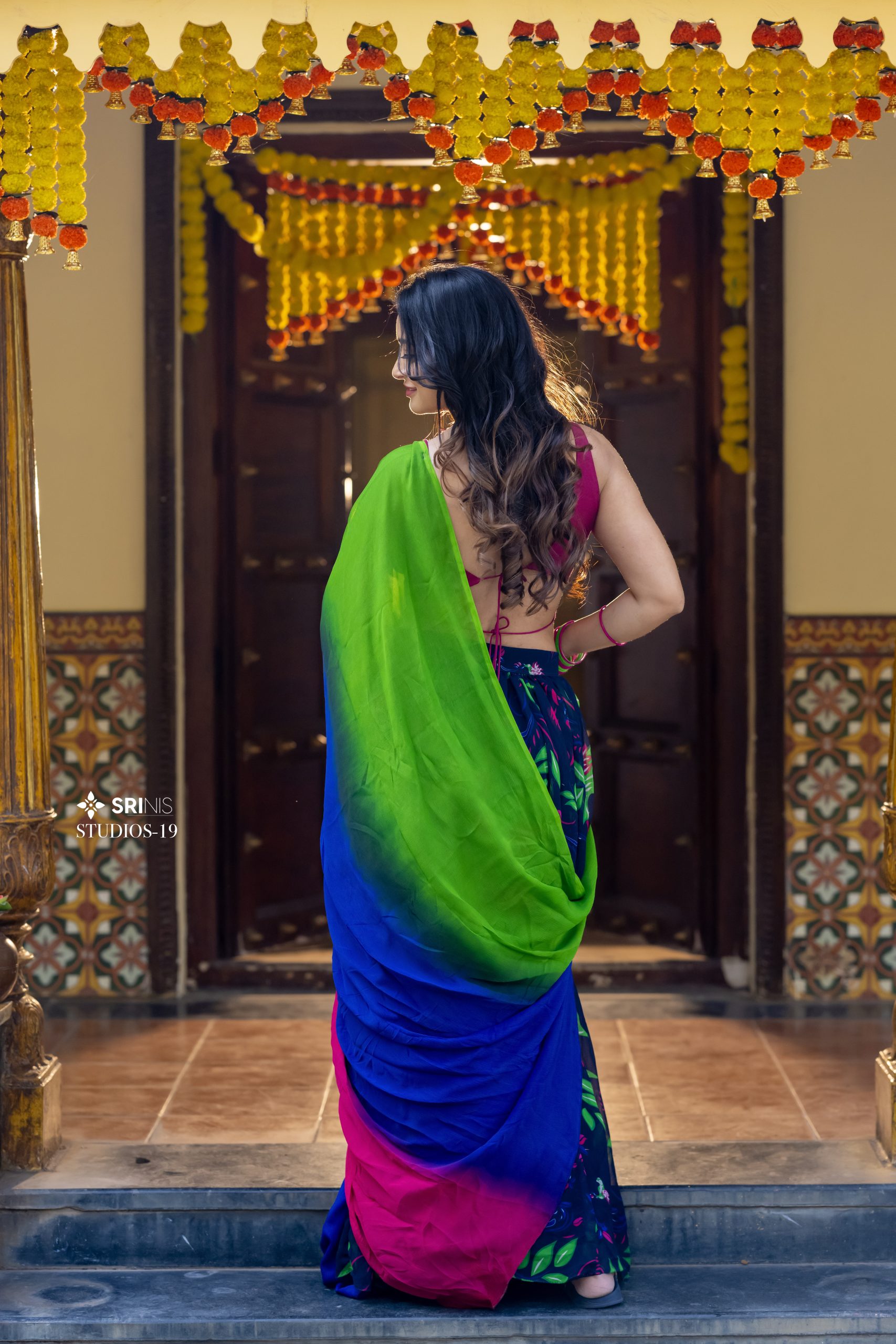 A stunning fusion of color and elegance, this printed georgette lehenga set features a vivid floral skirt, paired with a contrasting blouse and a dual-tone drape that adds a modern twist. Lightweight, flowy, and festive — perfect for celebrations that call for effortless grace and vibrant charm.