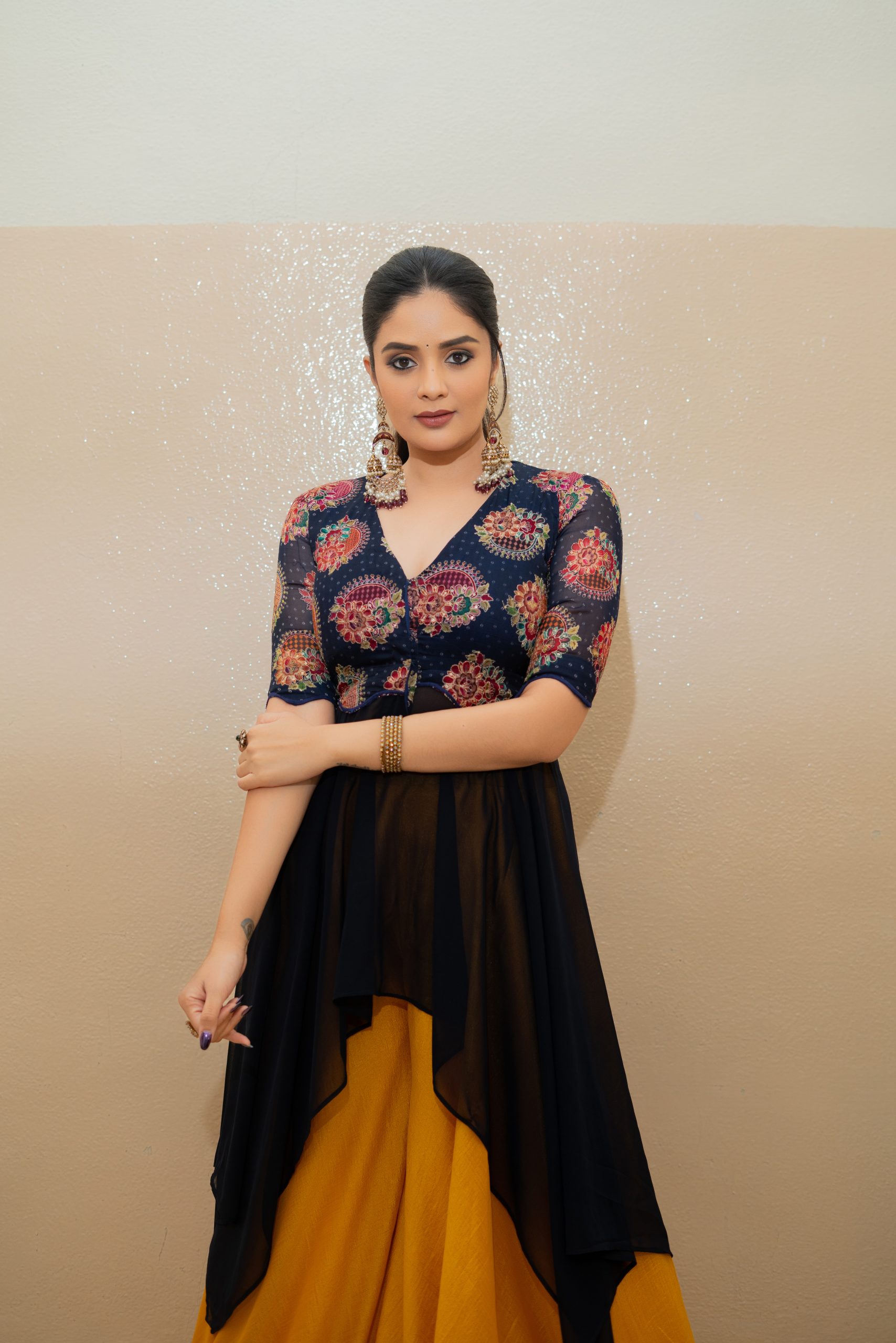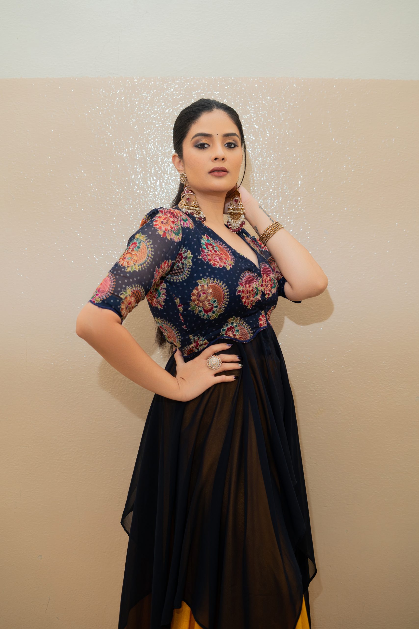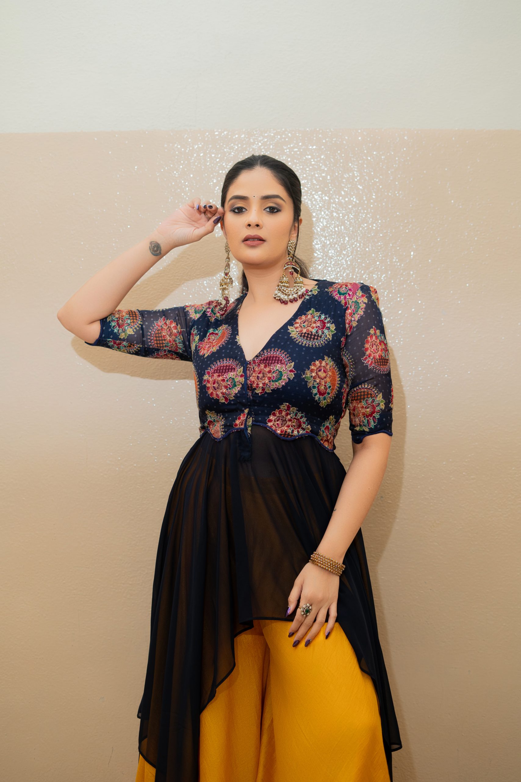 Grace meets style in this stunning ensemble featuring a Lillysilk full-flare palazzo paired with a flowy georgette overlay. The printed yoke adds a pop of artistry, enhanced with a subtle maggam touch for a hint of traditional elegance. Perfect for festive occasions or evening gatherings, this outfit blends modern flair with timeless charm.