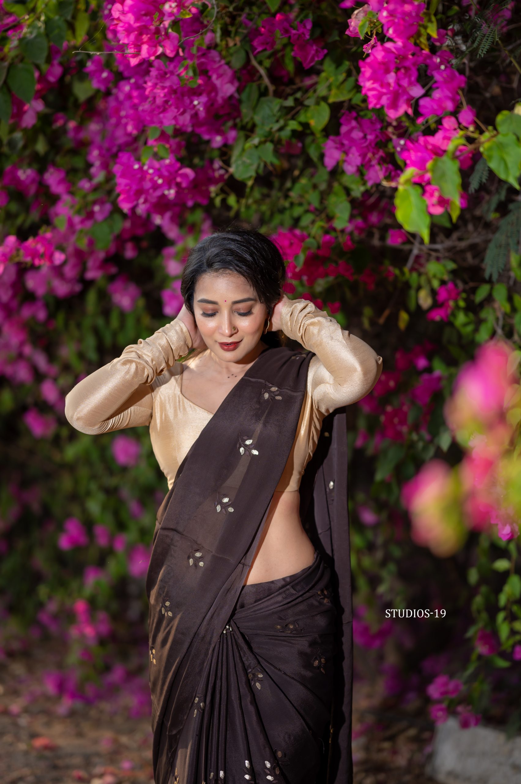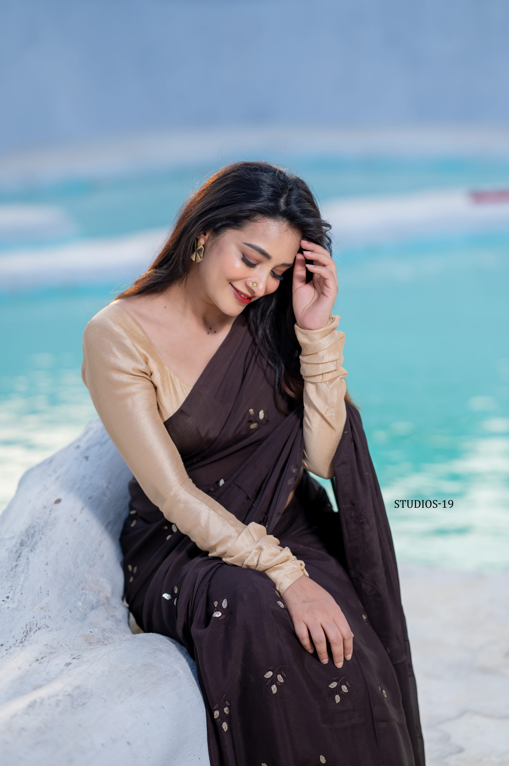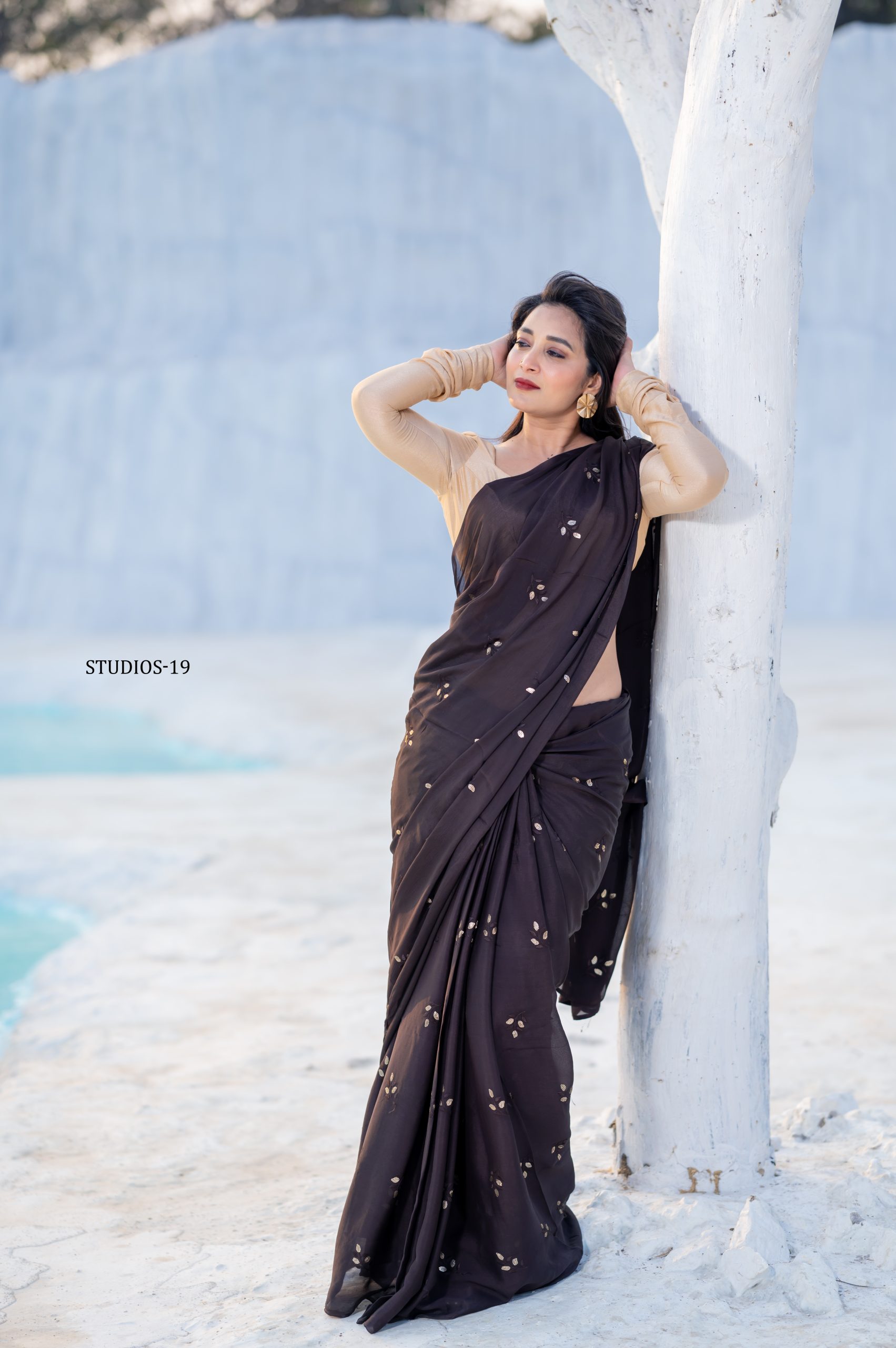 This stunning black georgette saree features delicate sequin embellishments that add just the right amount of sparkle. Crafted from lightweight, flowy fabric, it drapes beautifully and offers a graceful silhouette—ideal for festive occasions, parties, or elegant evening events.