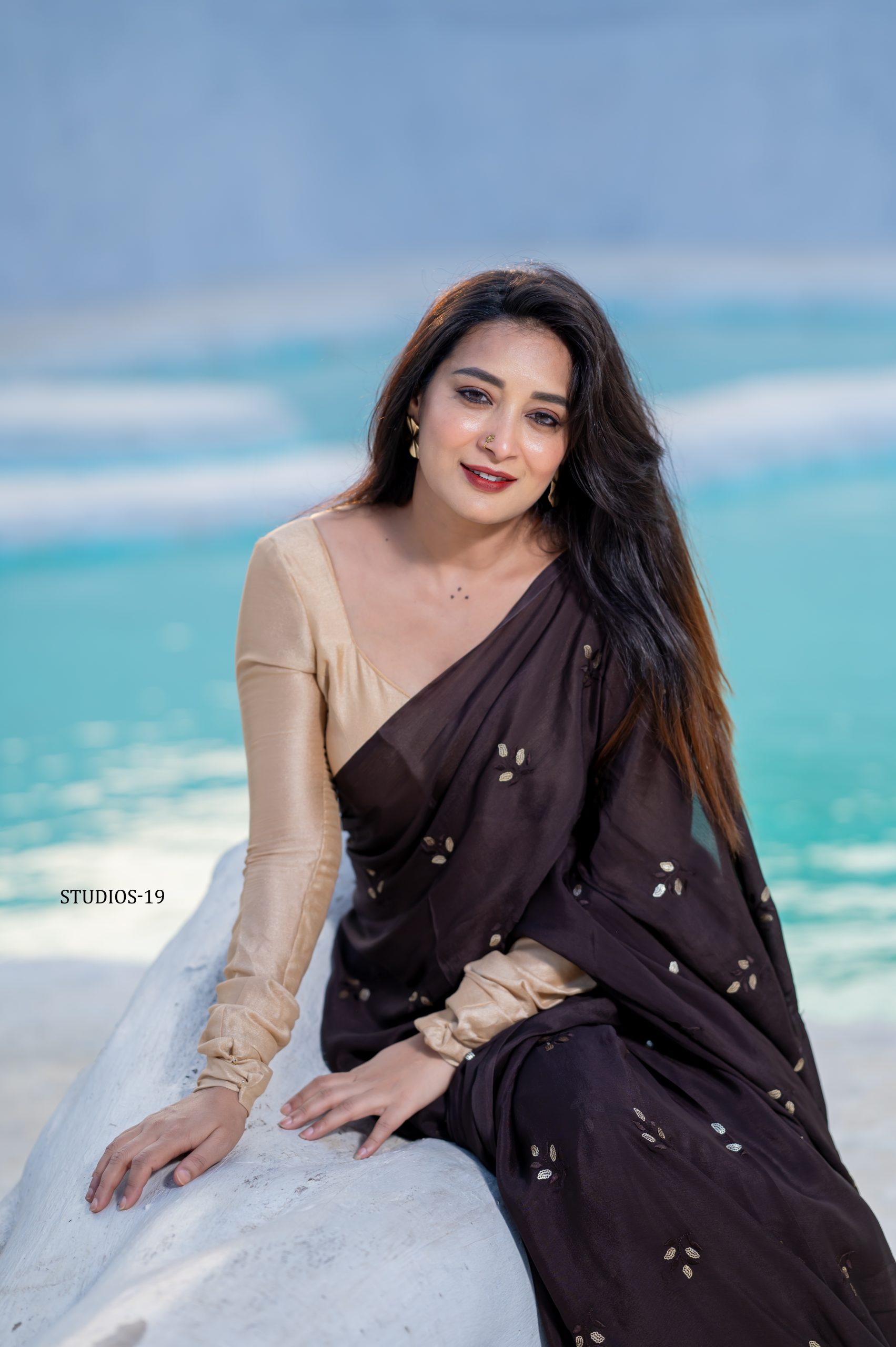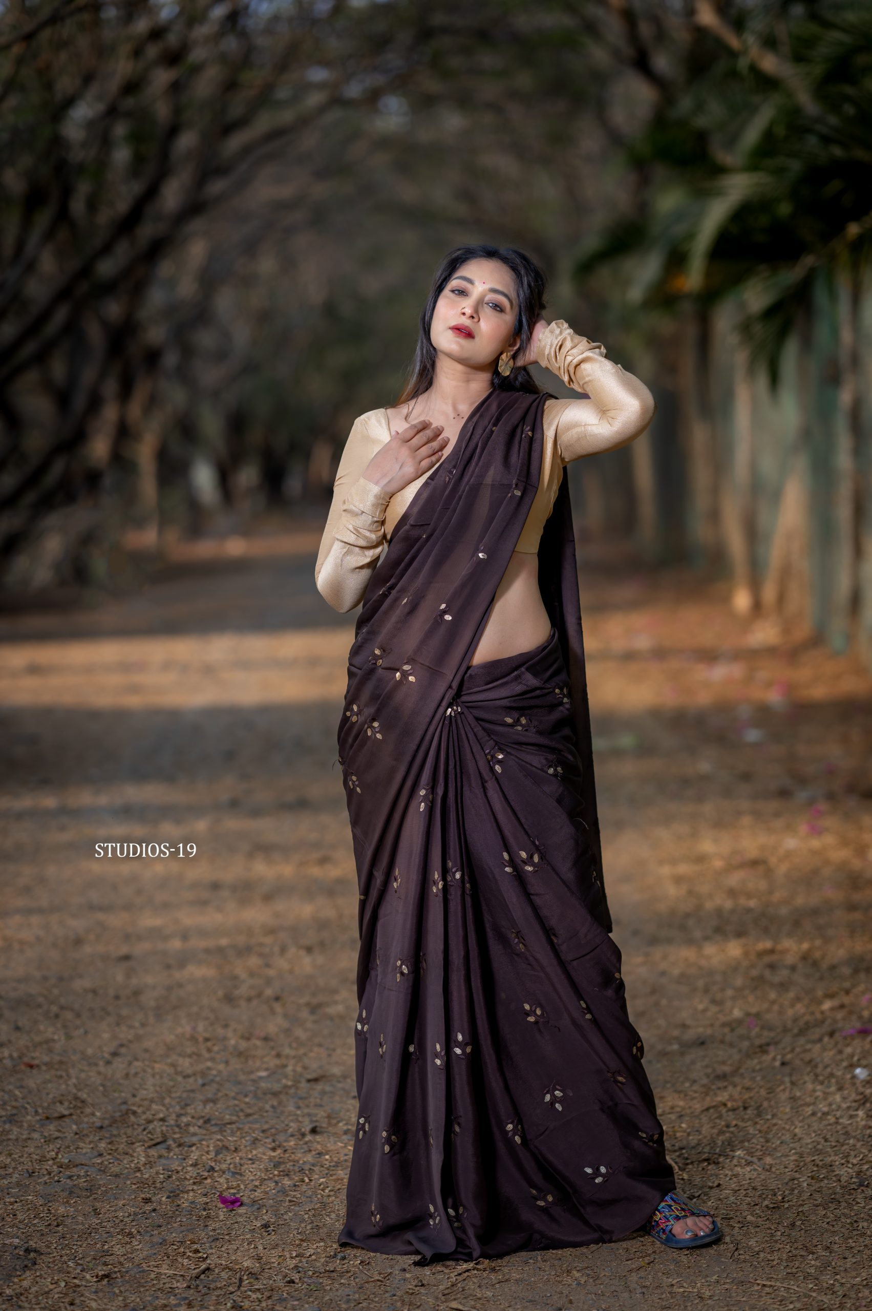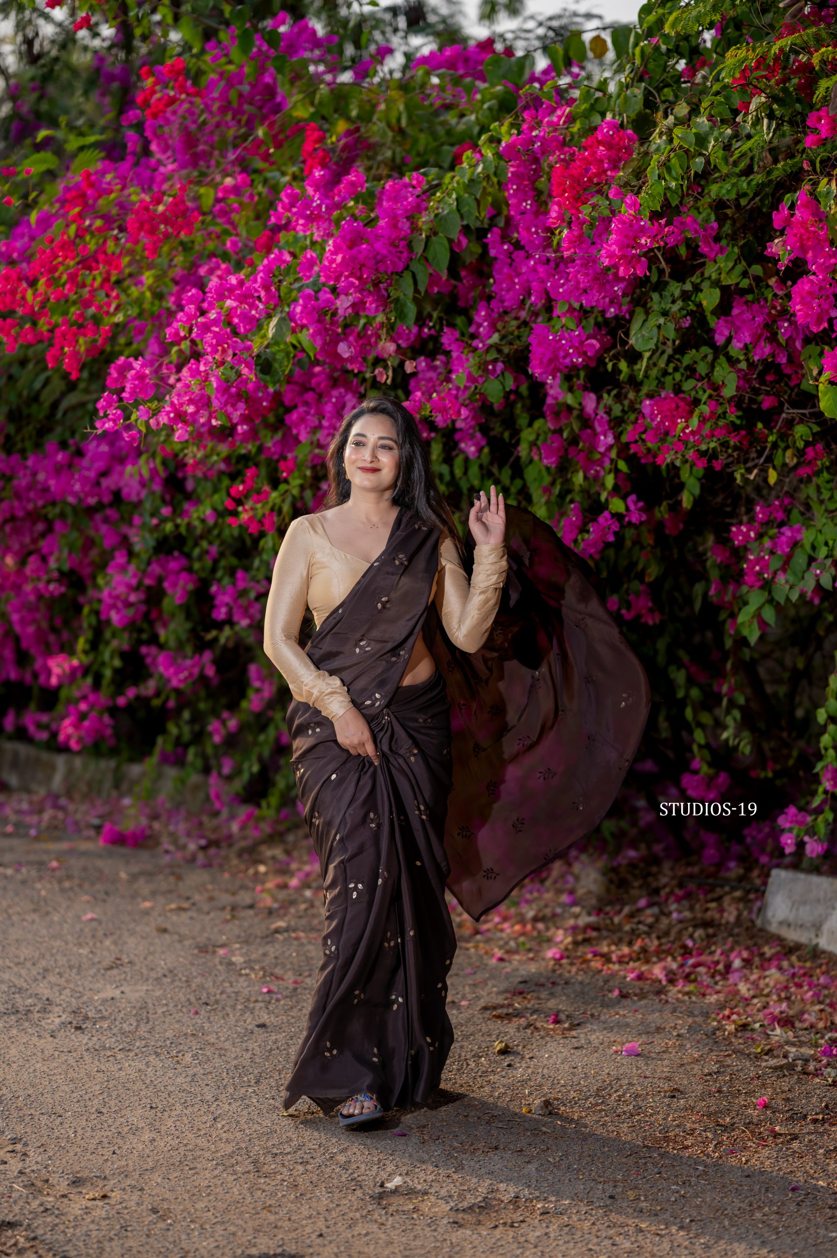 This stunning black georgette saree features delicate sequin embellishments that add just the right amount of sparkle. Crafted from lightweight, flowy fabric, it drapes beautifully and offers a graceful silhouette—ideal for festive occasions, parties, or elegant evening events.