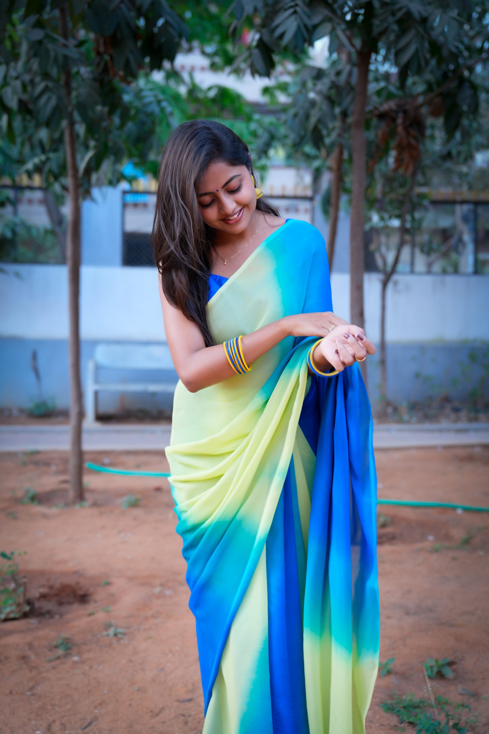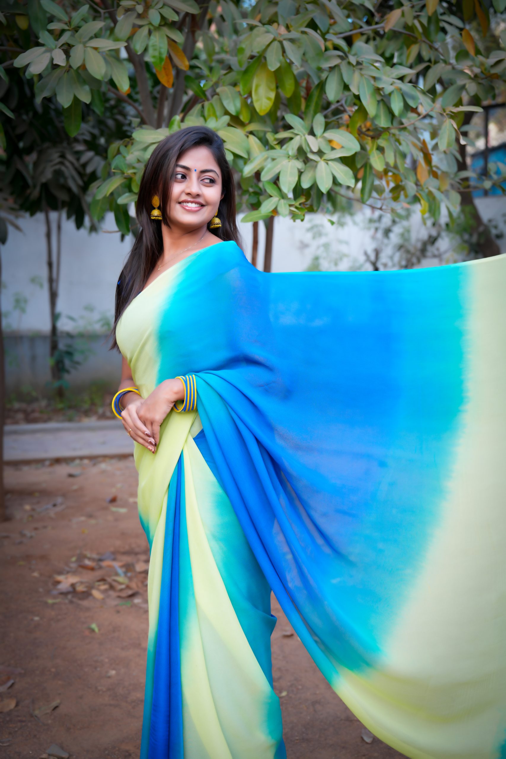 This exquisite pure georgette saree features a stunning natural triple-shaded design, blending soothing hues seamlessly. Its soft, flowy texture drapes beautifully, offering an elegant and graceful look perfect for festive or casual occasions.