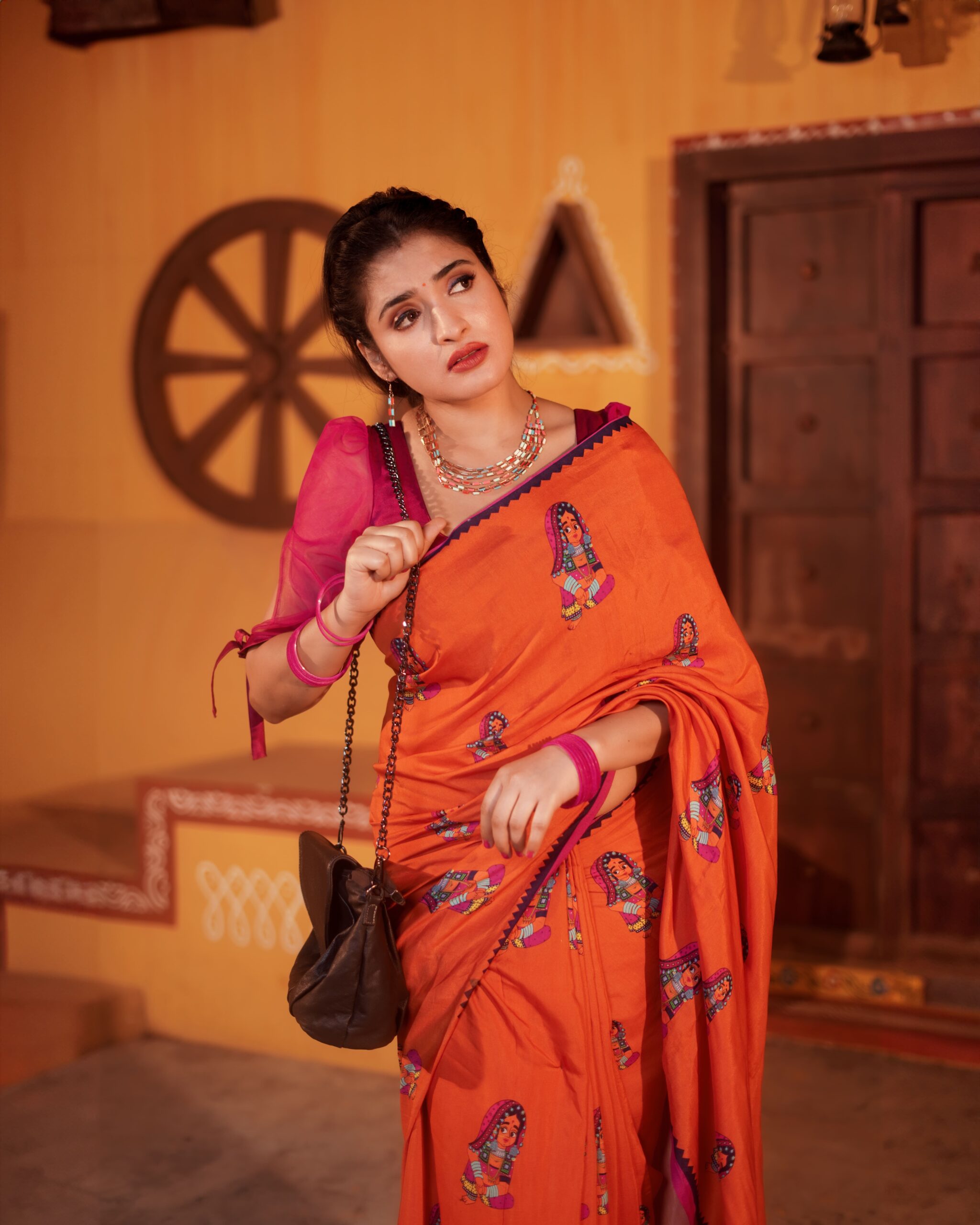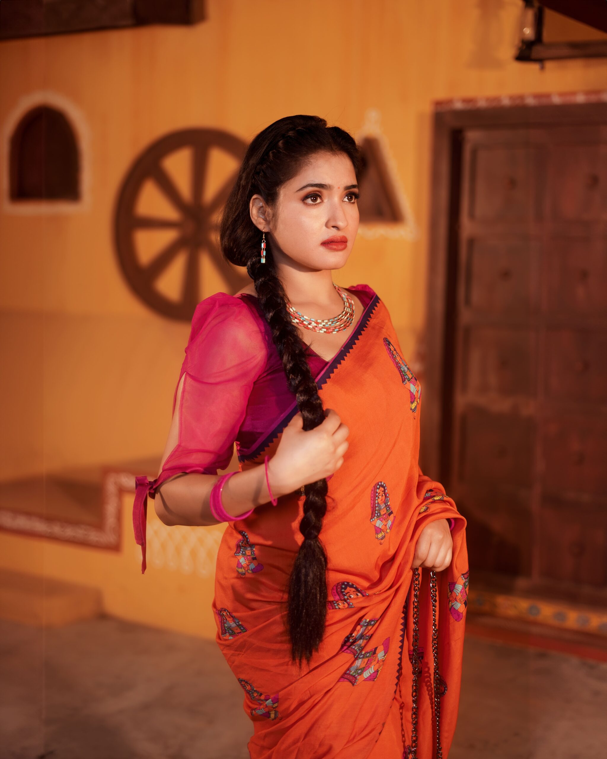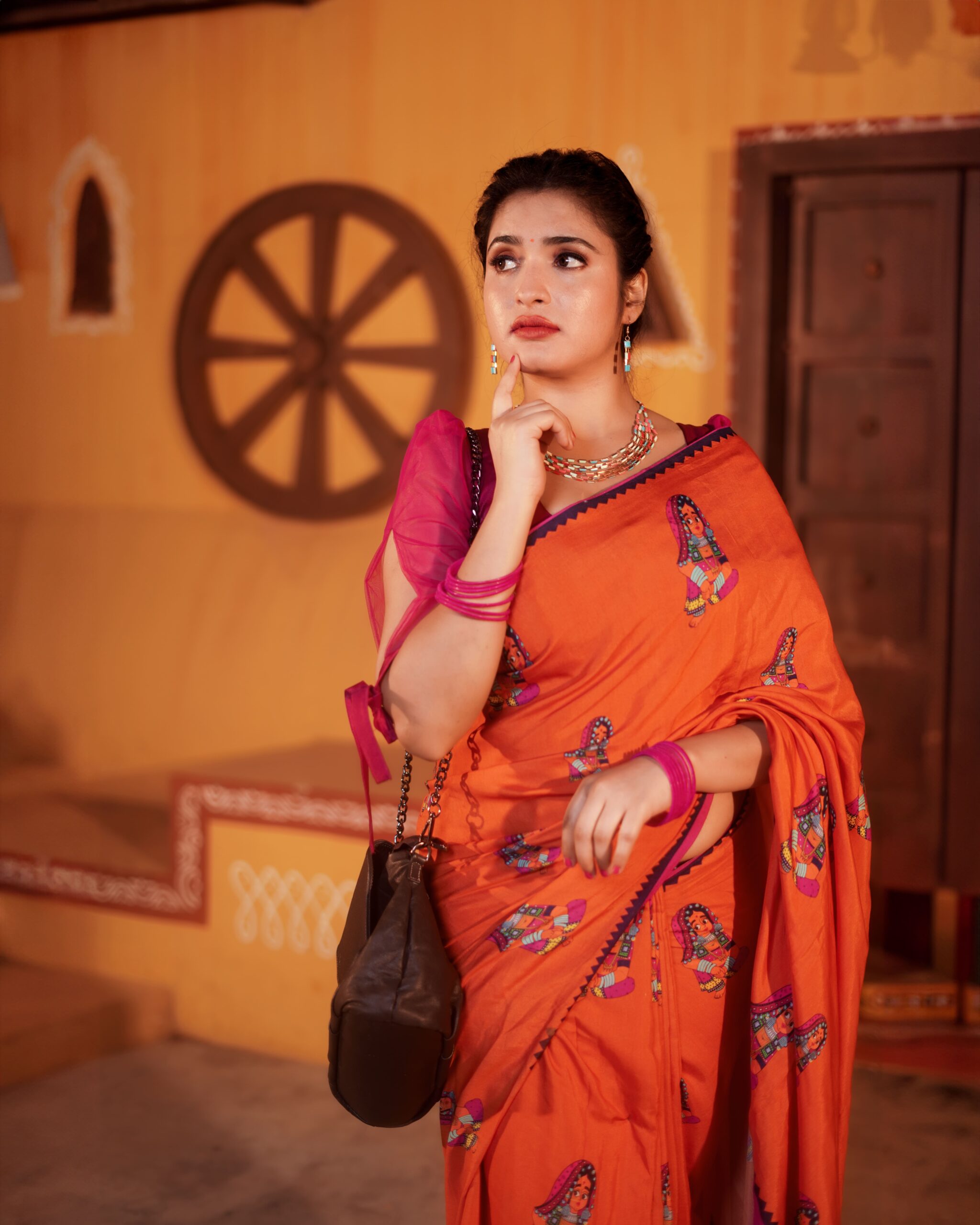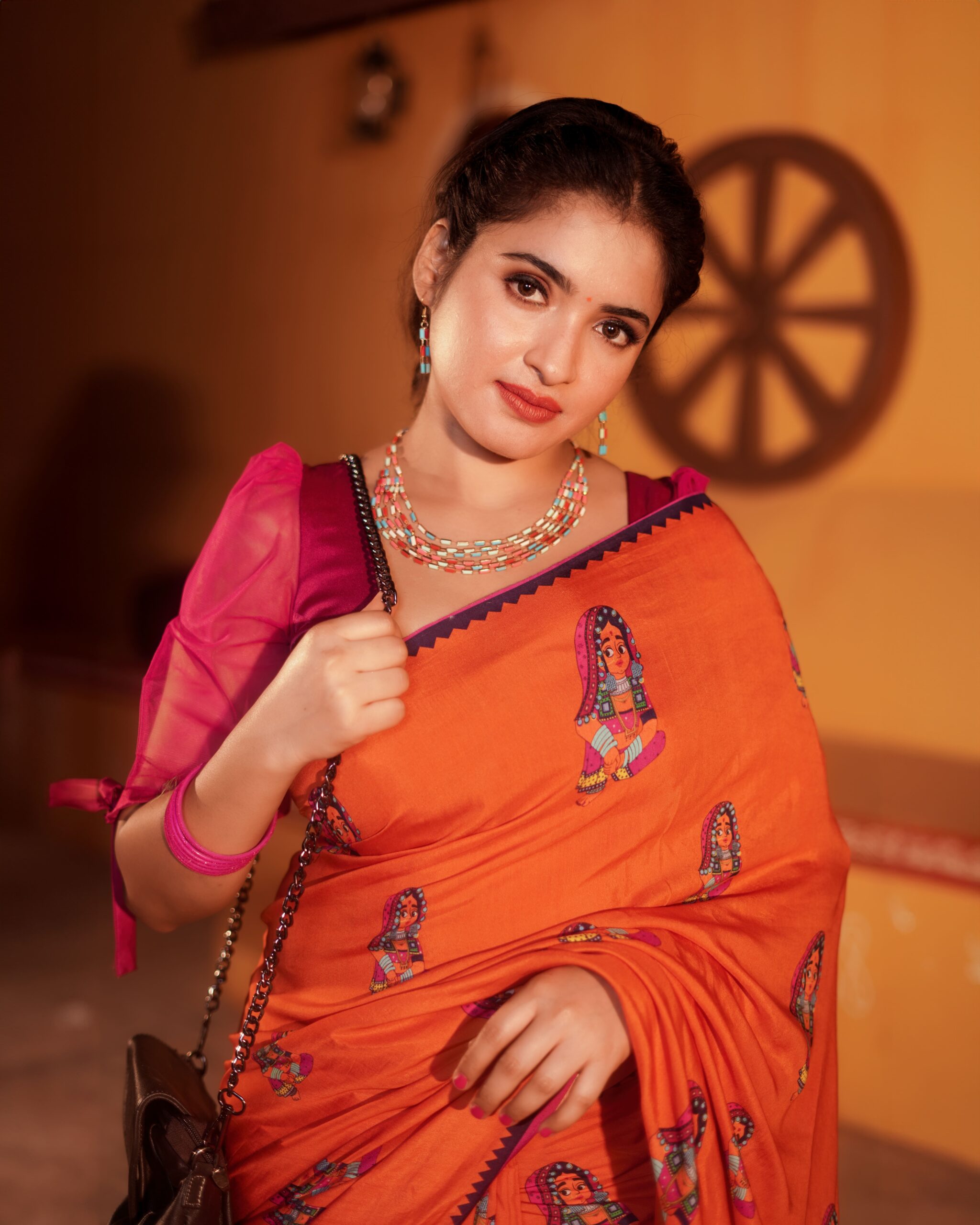 This exquisite saree is crafted from pure muslin, known for its soft texture and elegant fall. The saree features artful printed motifs that add a touch of ethnic artistry to its contemporary appeal. Paired with a beautifully designed blouse featuring sheer net sleeves and delicate tie-up detailing near the cuffs, this ensemble exudes a perfect blend of charm and sophistication.