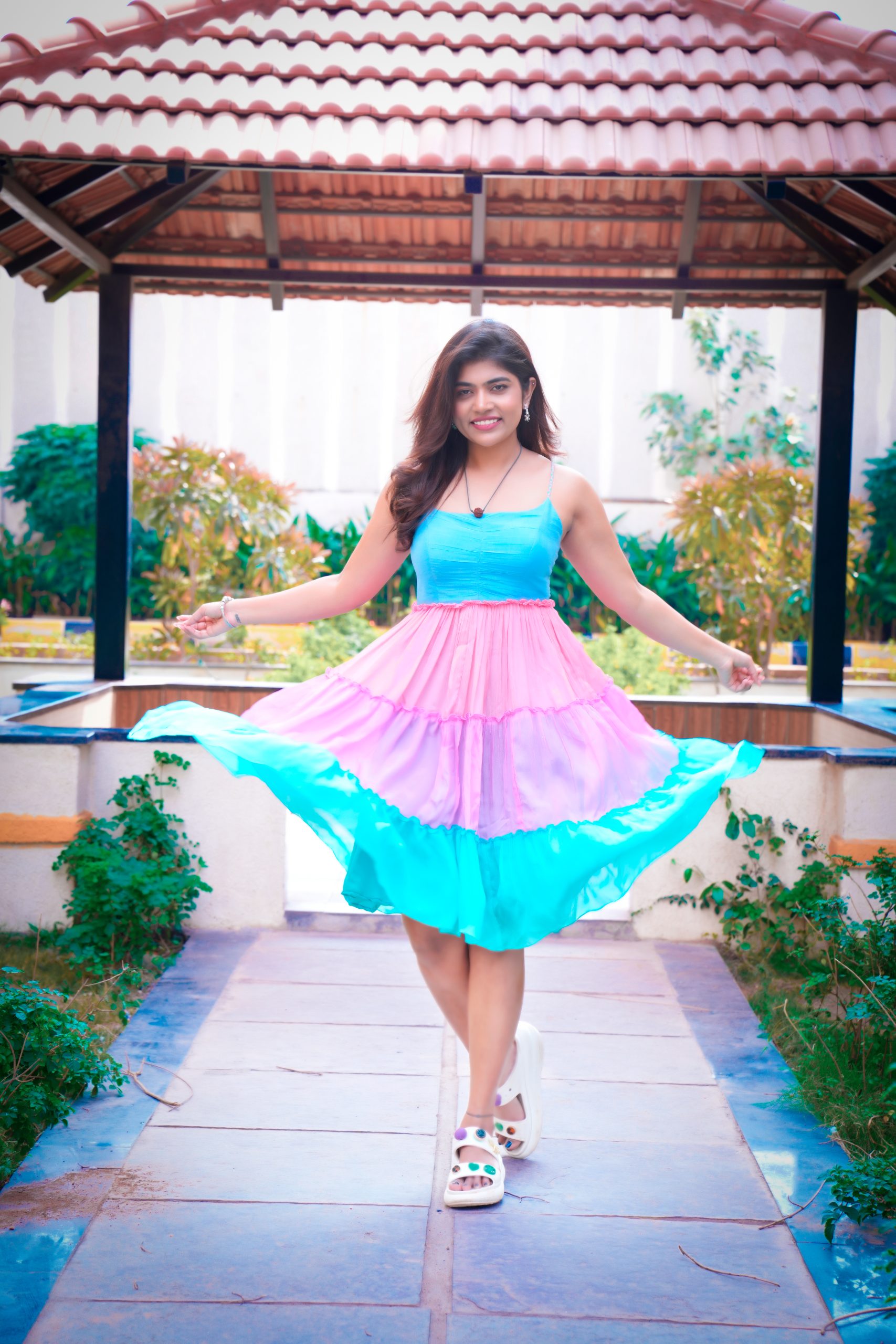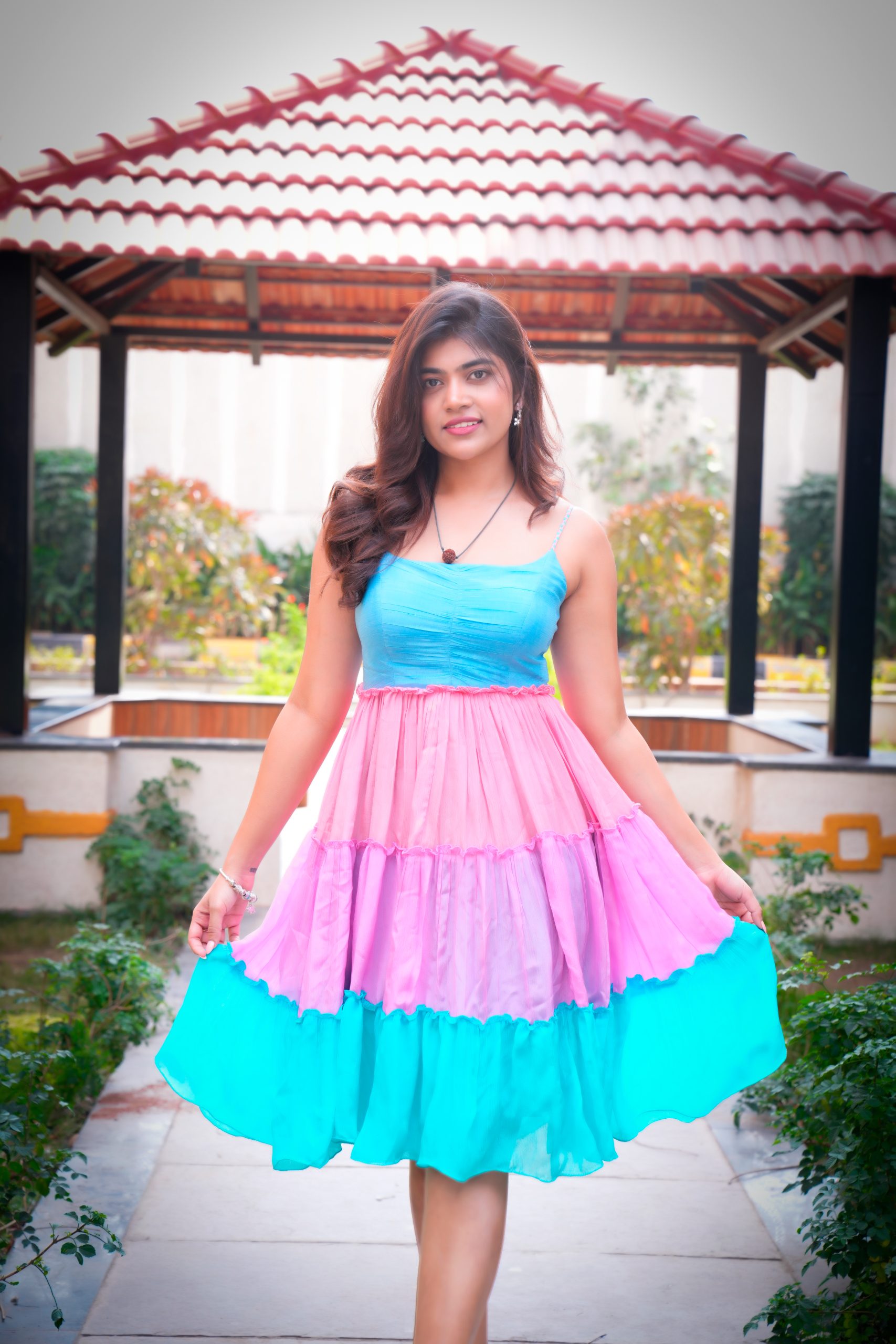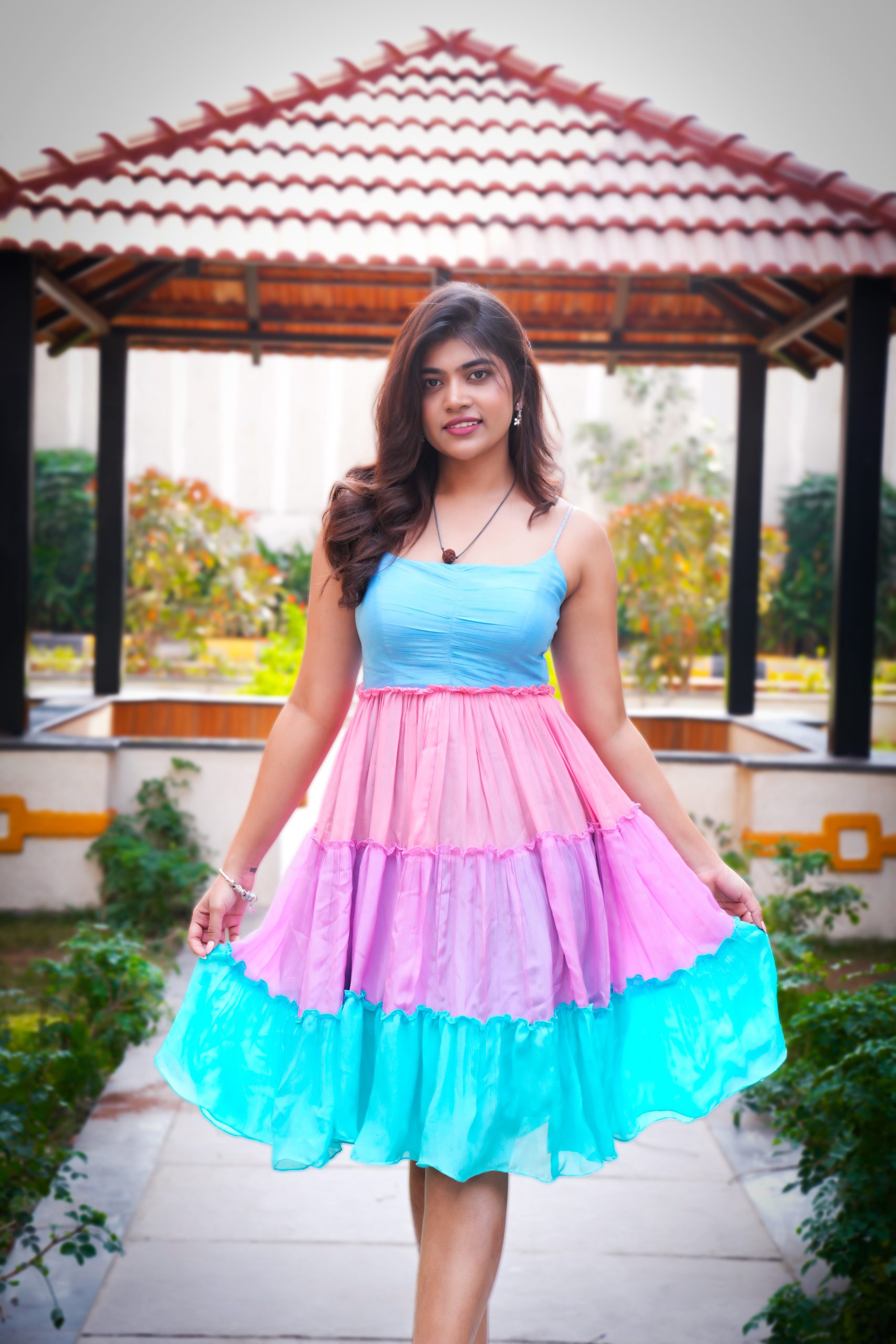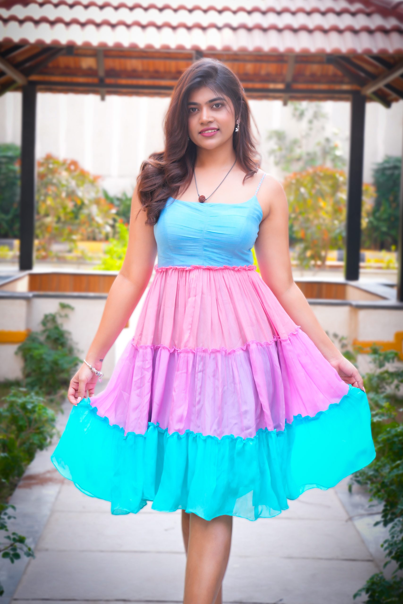 A dreamy Chinon frock in soft, natural-dyed hues, featuring delicate shoulder straps and a playful triple-tone flare. The elastic back with triple-color straps ensures a perfect fit, making this outfit both charming and effortlessly stylish — perfect for brunches or sunny day outings.