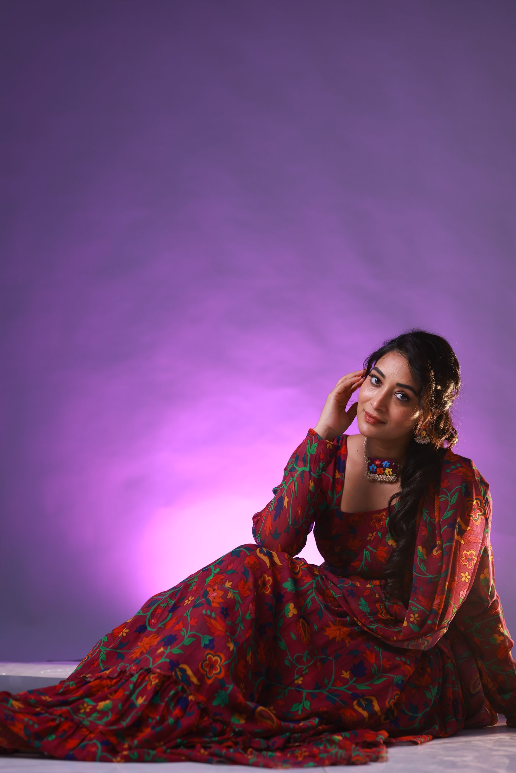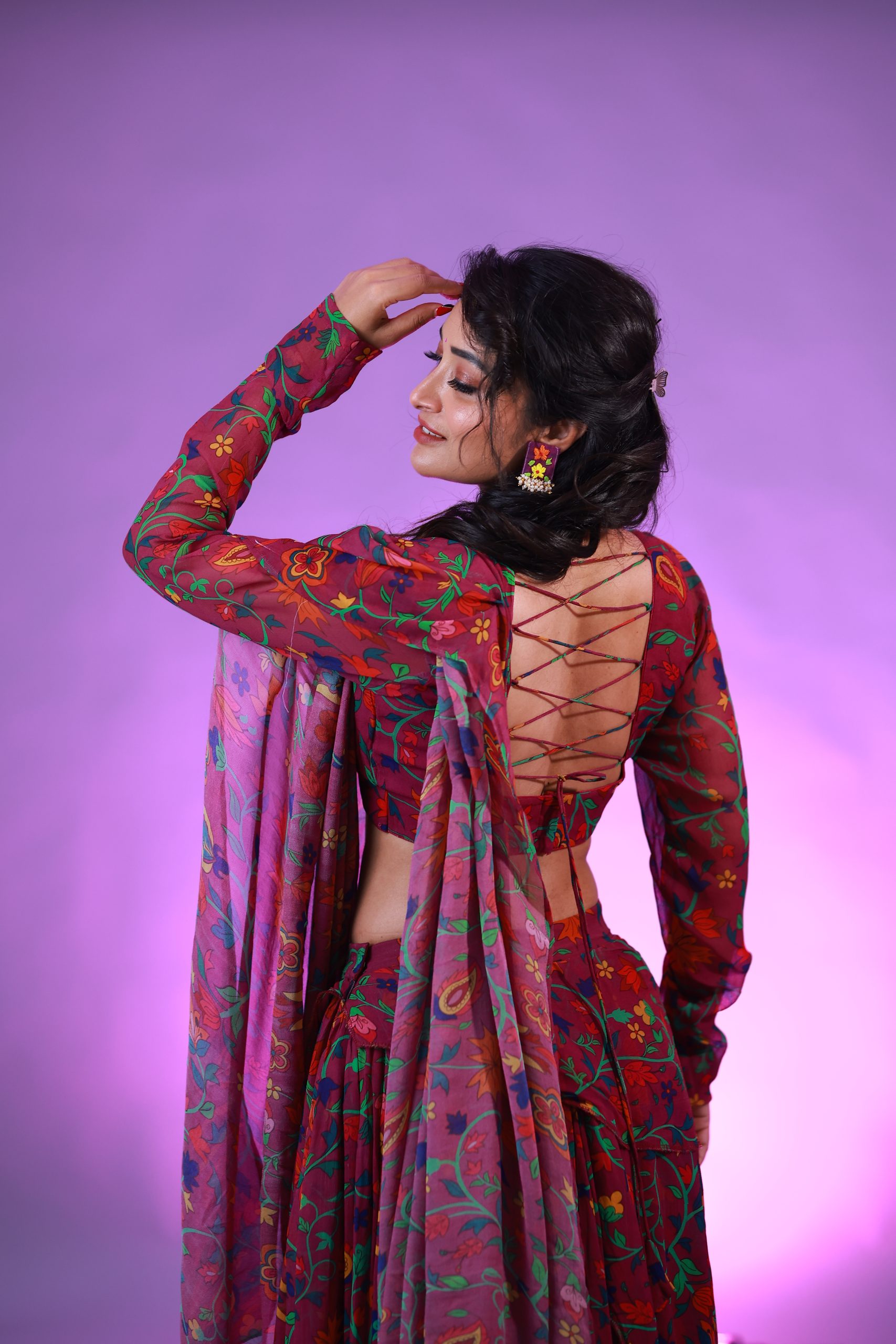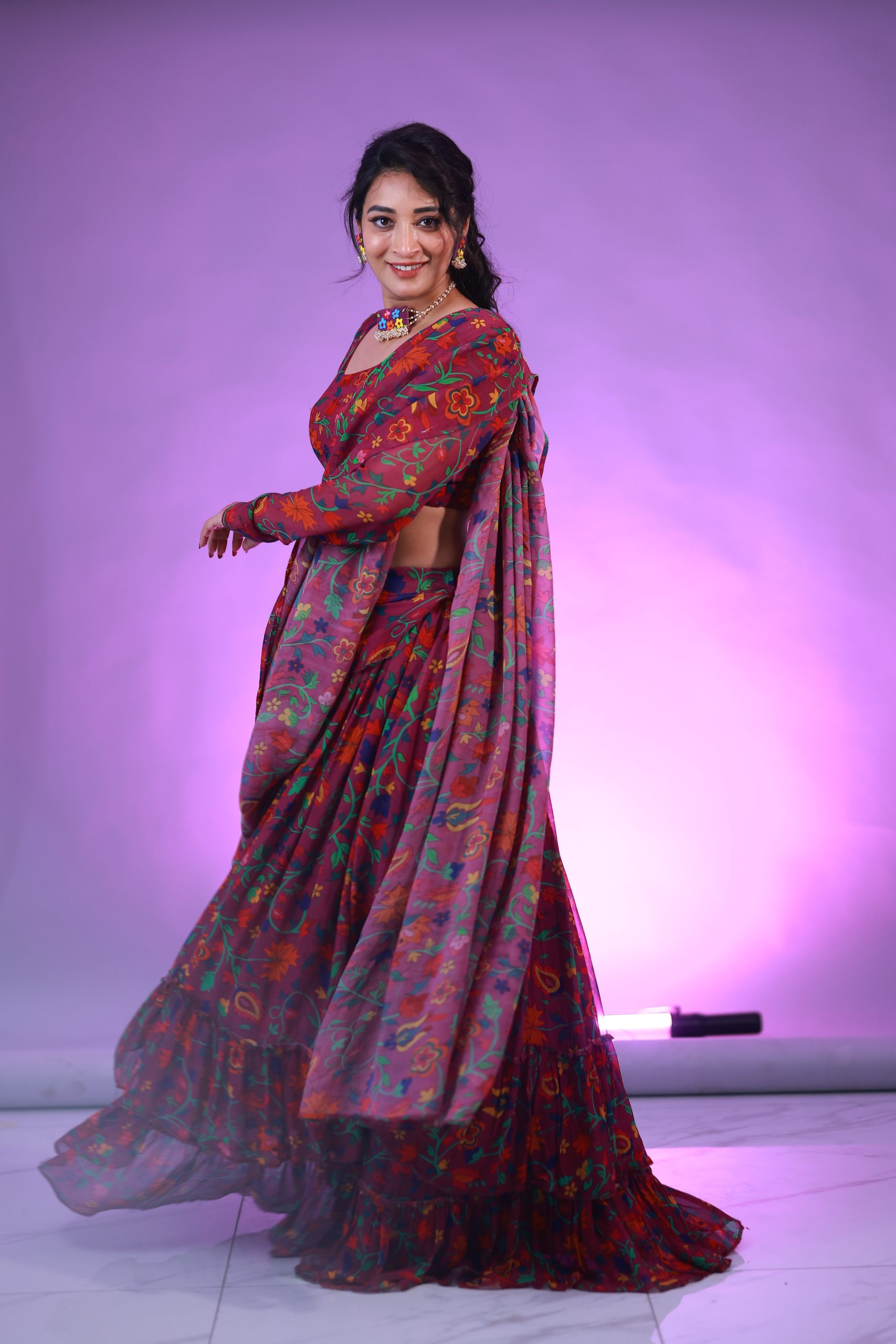 Twirl in Style — Embrace elegance with this enchanting 3-piece set. It features a designer double-layered printed georgette lehenga with a full gher, and a beautifully detailed blouse with full chudi sleeves, a unique neckline, and back tieing. This set is perfectly paired with a coordinating dupatta, and the entire ensemble is brought to life with vibrant floral detailing.