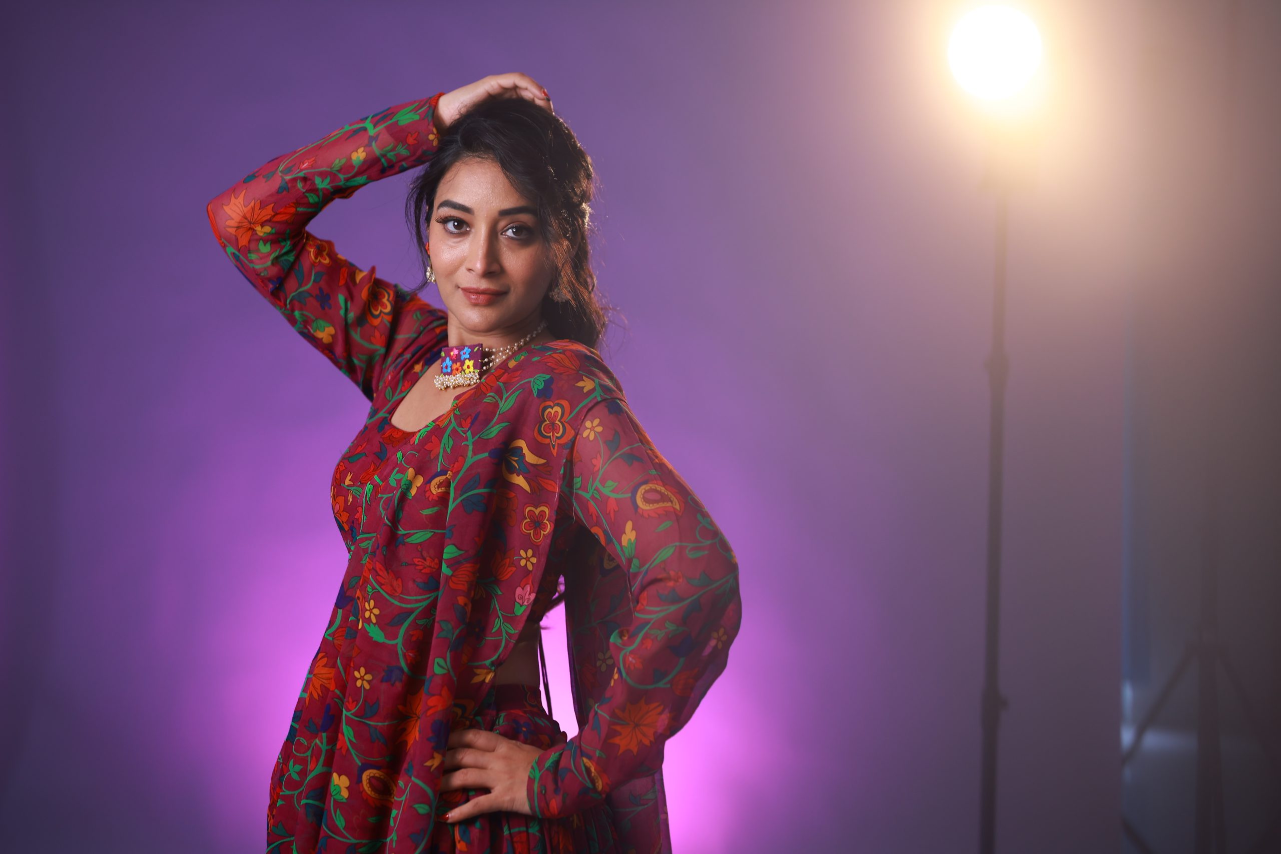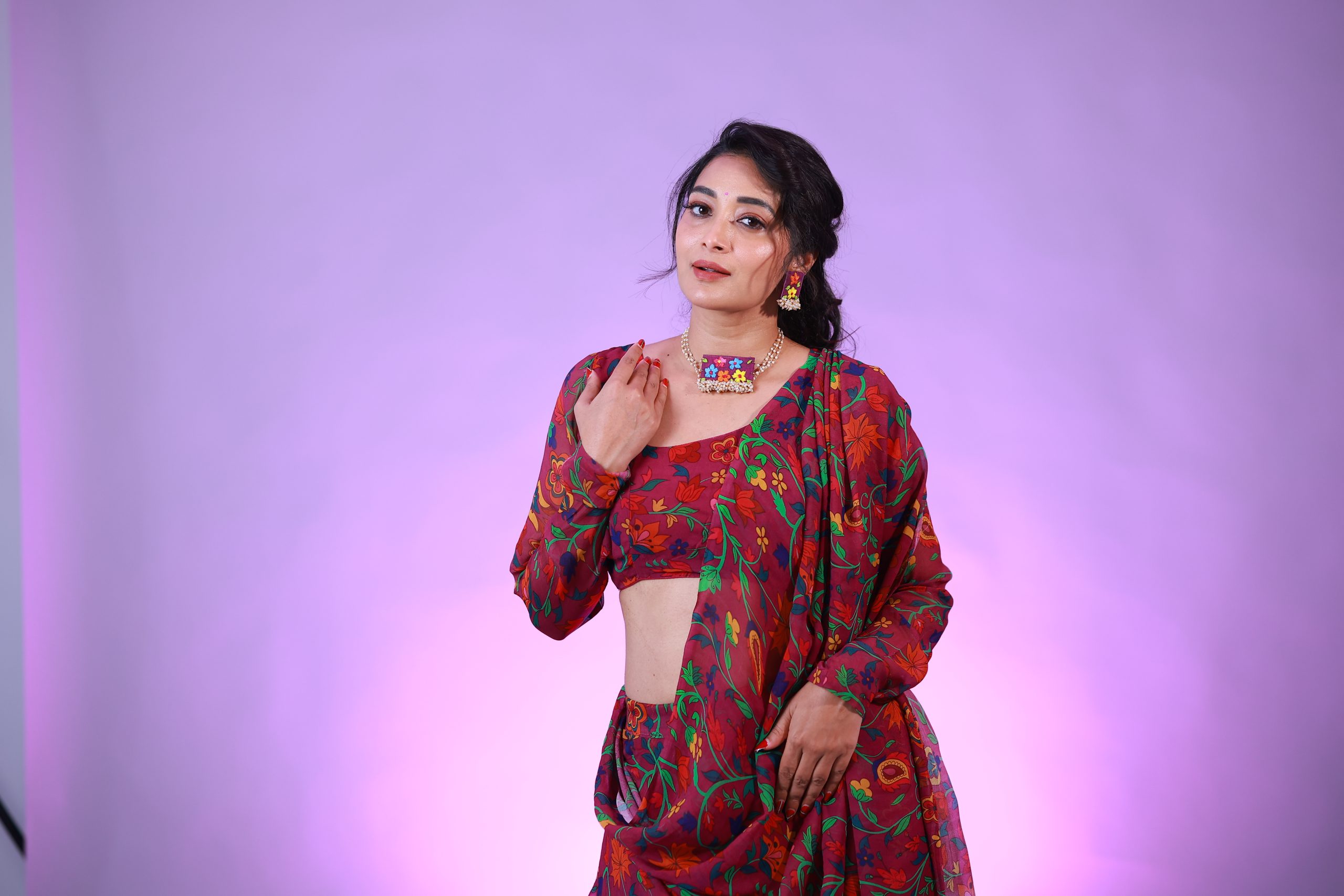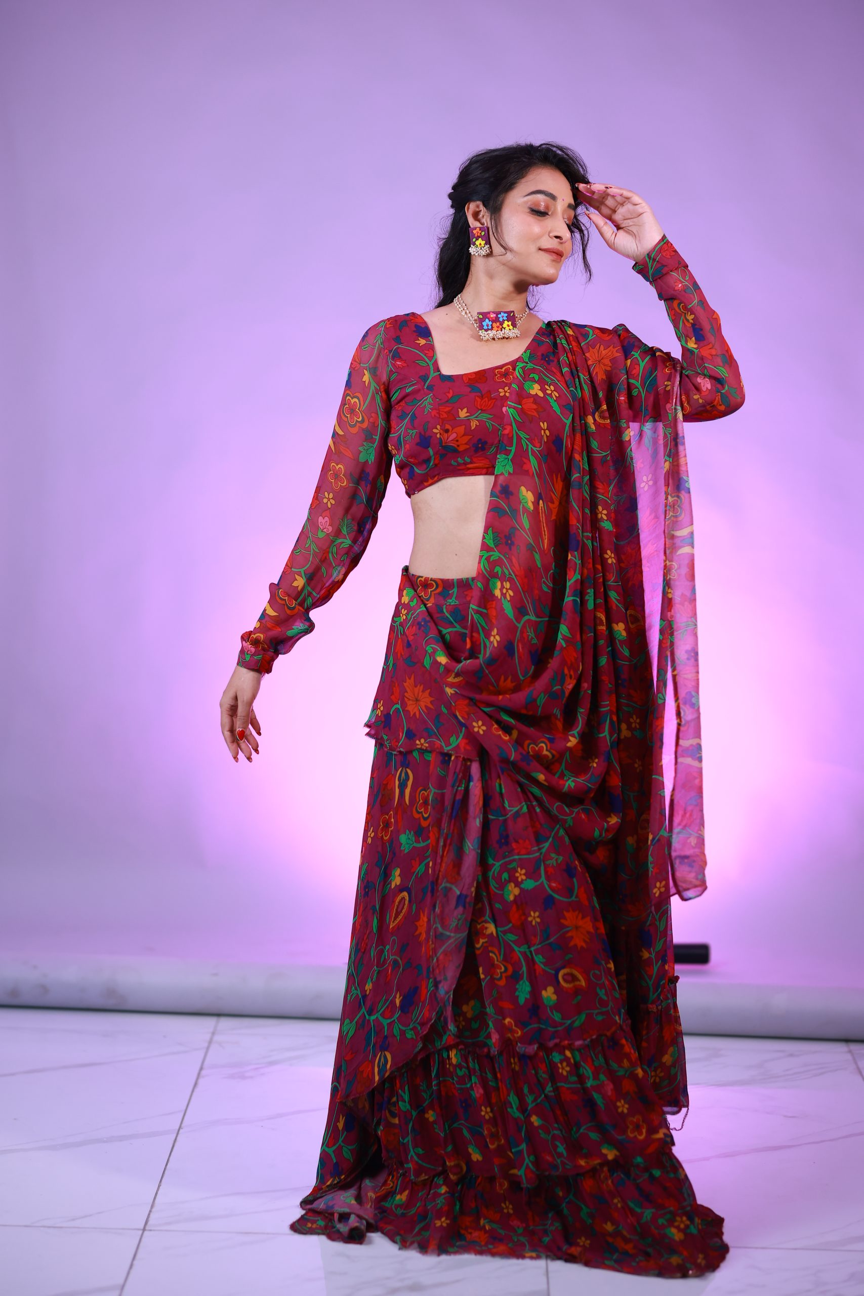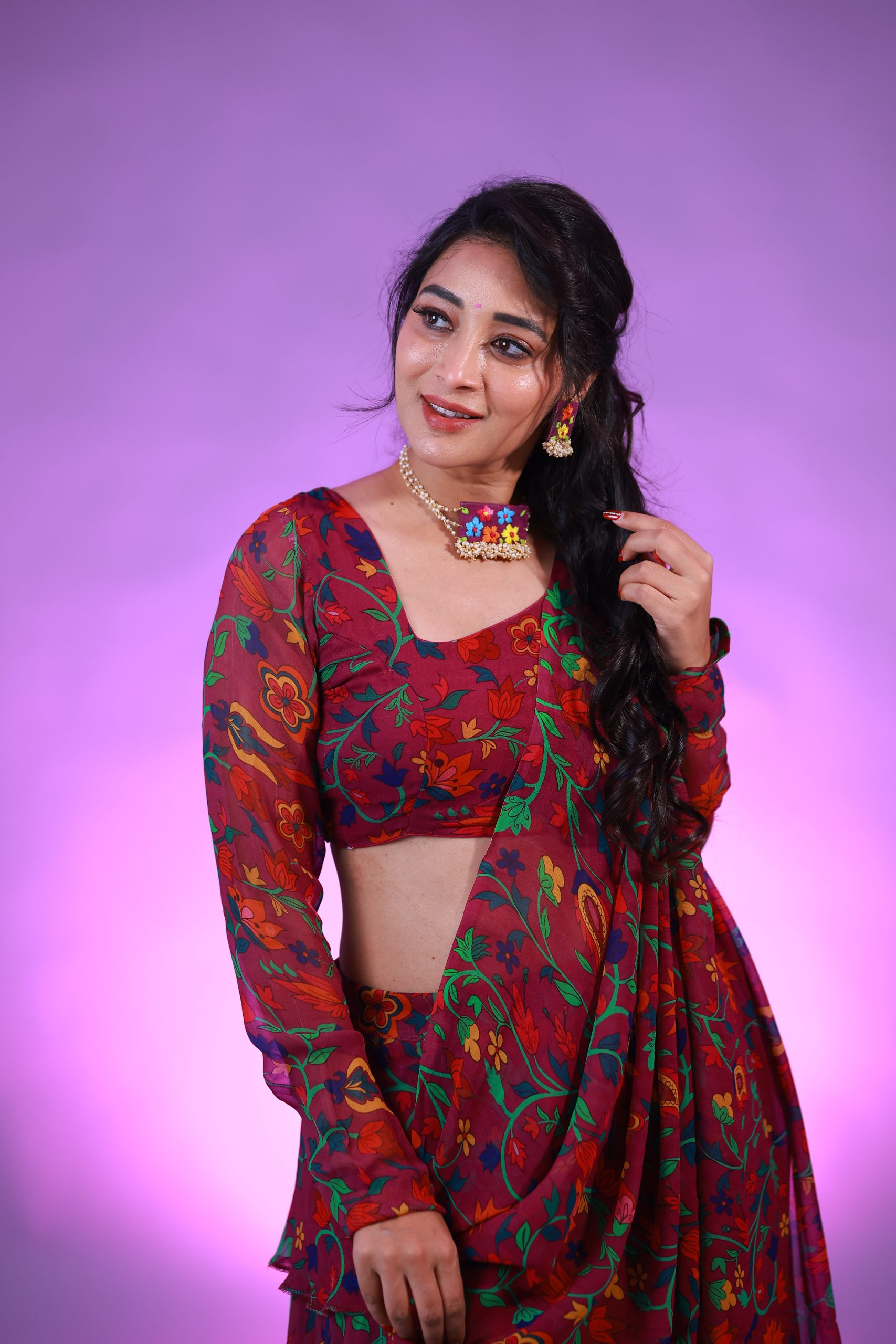 Twirl in Style — Embrace elegance with this enchanting 3-piece set. It features a designer double-layered printed georgette lehenga with a full gher, and a beautifully detailed blouse with full chudi sleeves, a unique neckline, and back tieing. This set is perfectly paired with a coordinating dupatta, and the entire ensemble is brought to life with vibrant floral detailing.