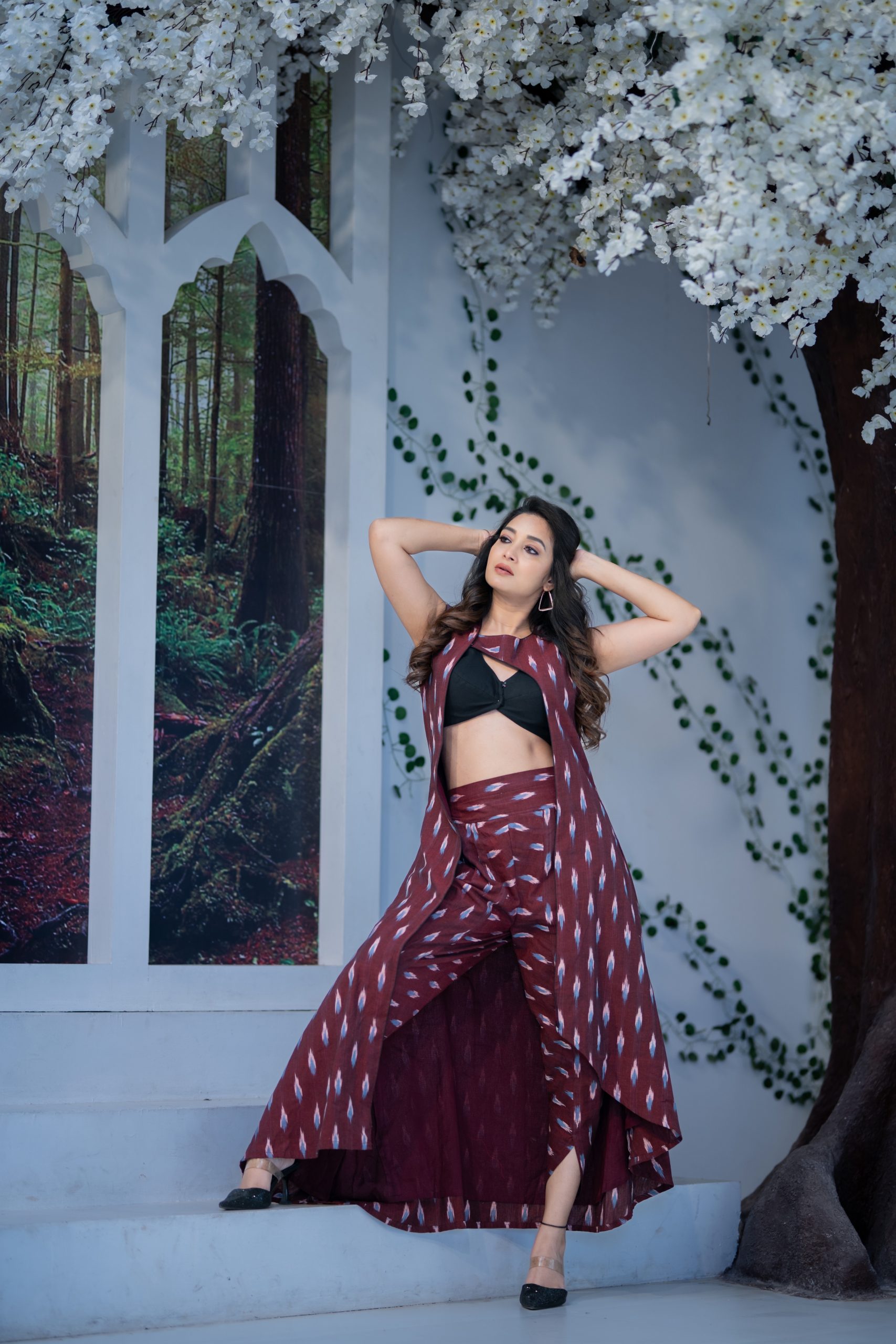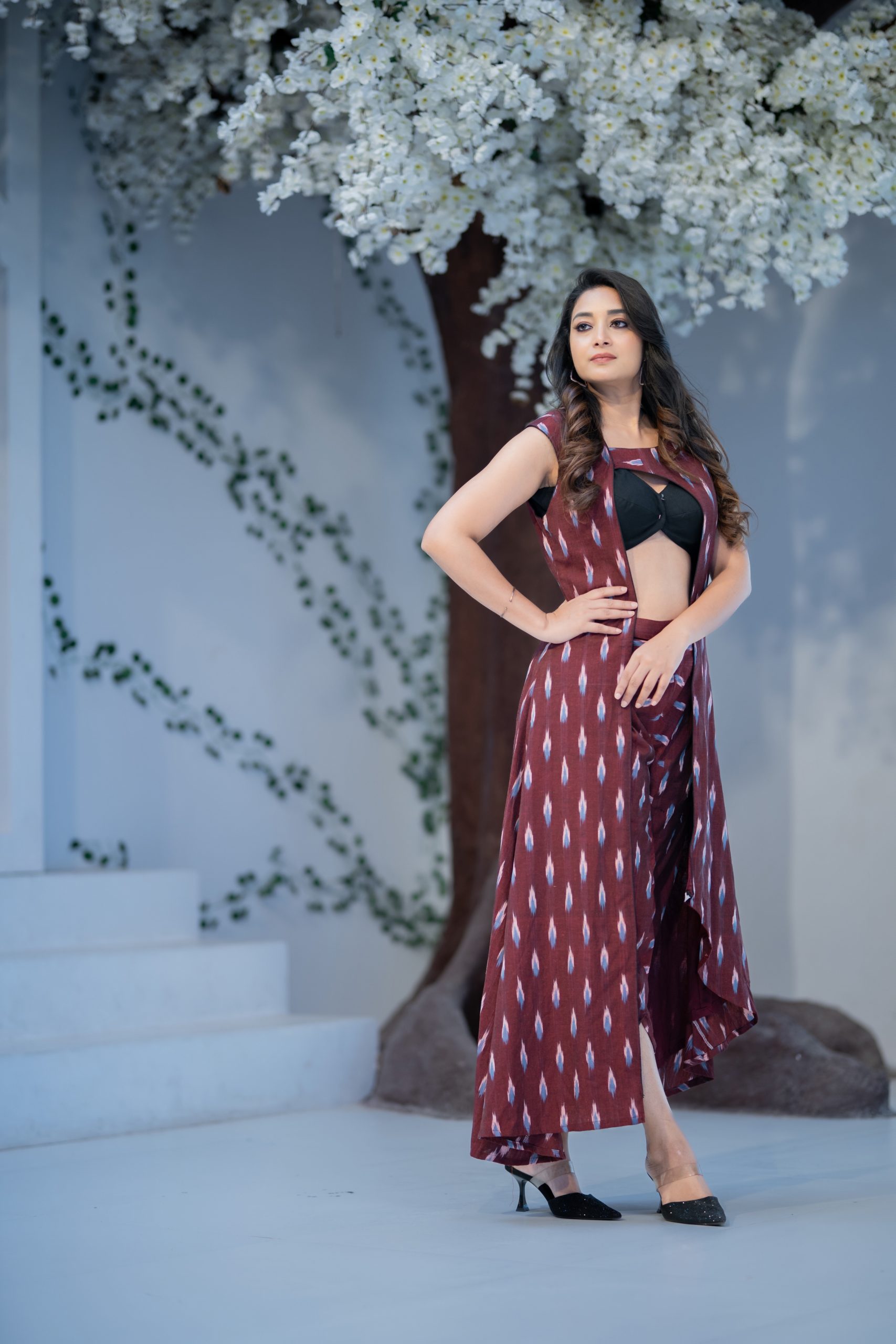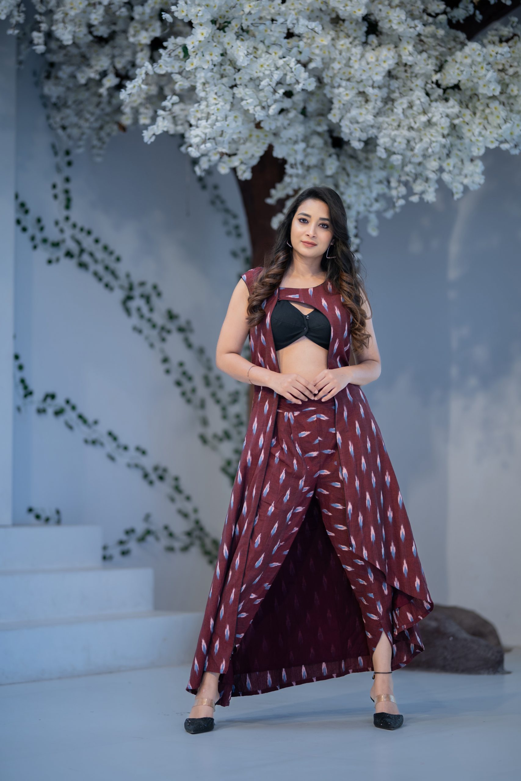 This stunning ensemble is crafted from pure Ikkat fabric, featuring timeless patterns and a rich maroon hue. The set includes a stylish sleeveless top, flowy drape jacket, and coordinated pants, blending traditional craftsmanship with a modern silhouette. Perfect for festive occasions or elegant evening wear.