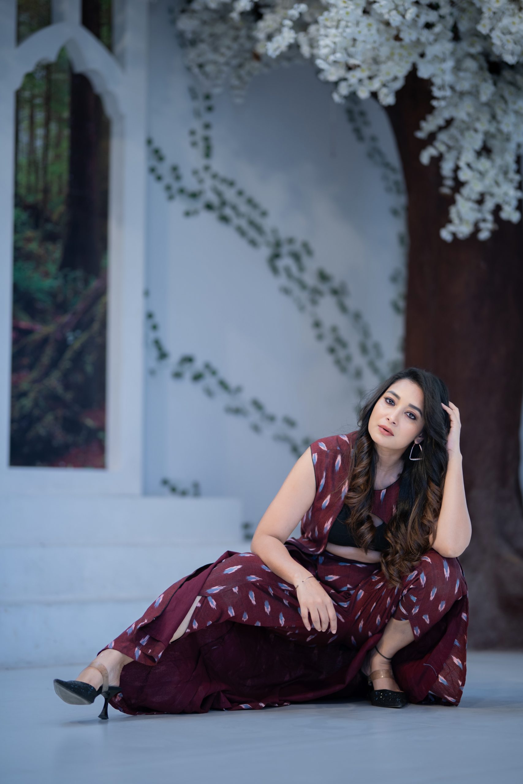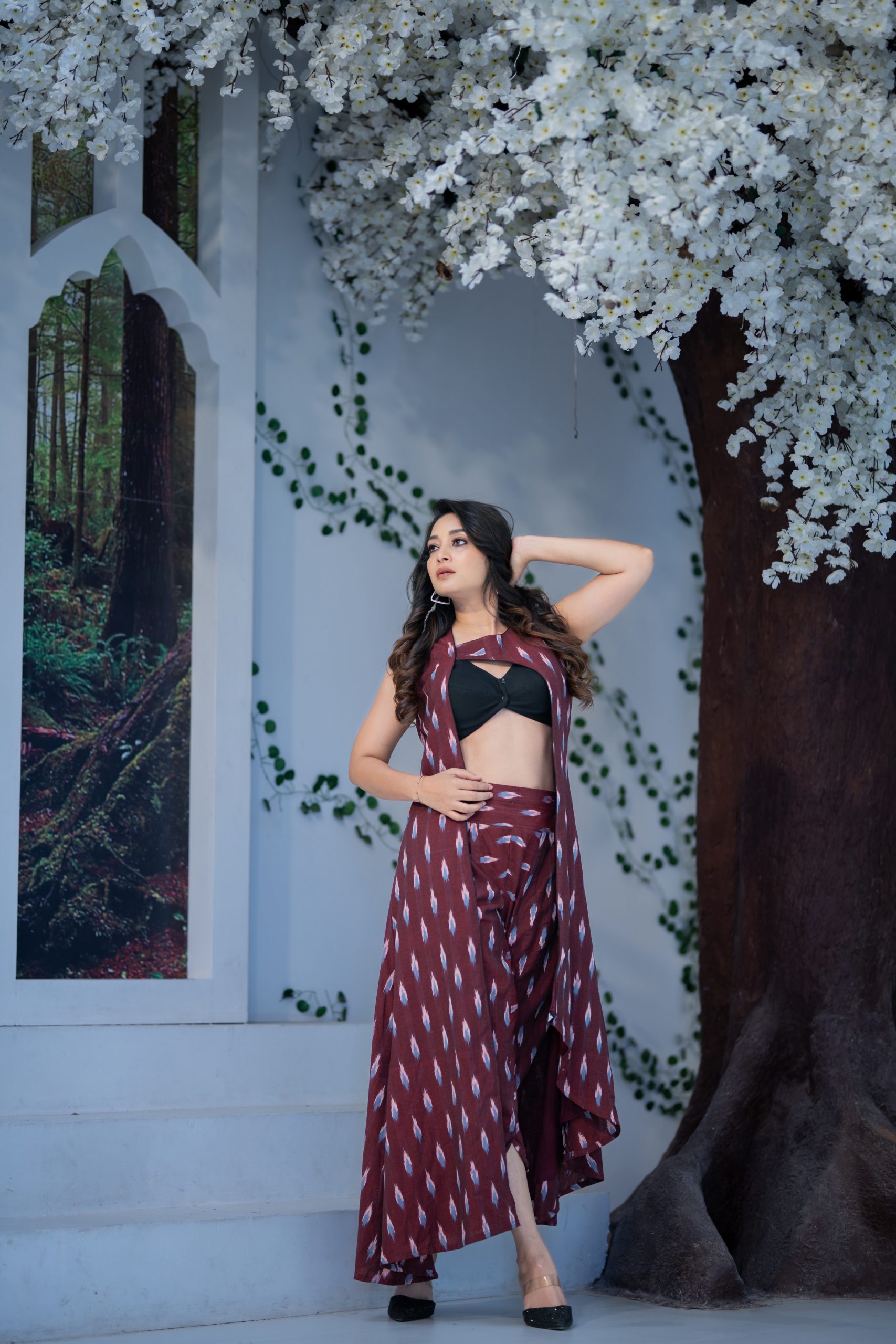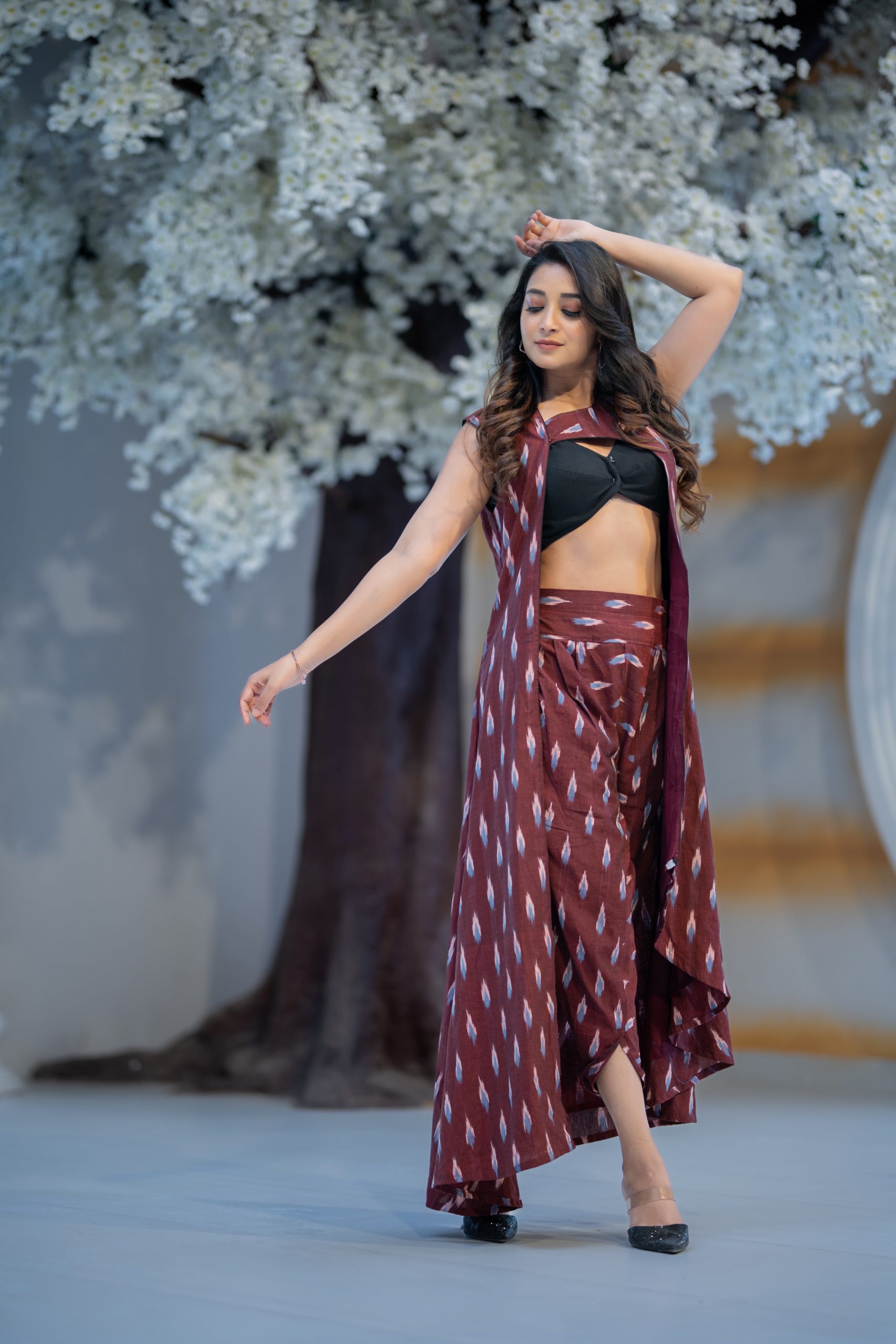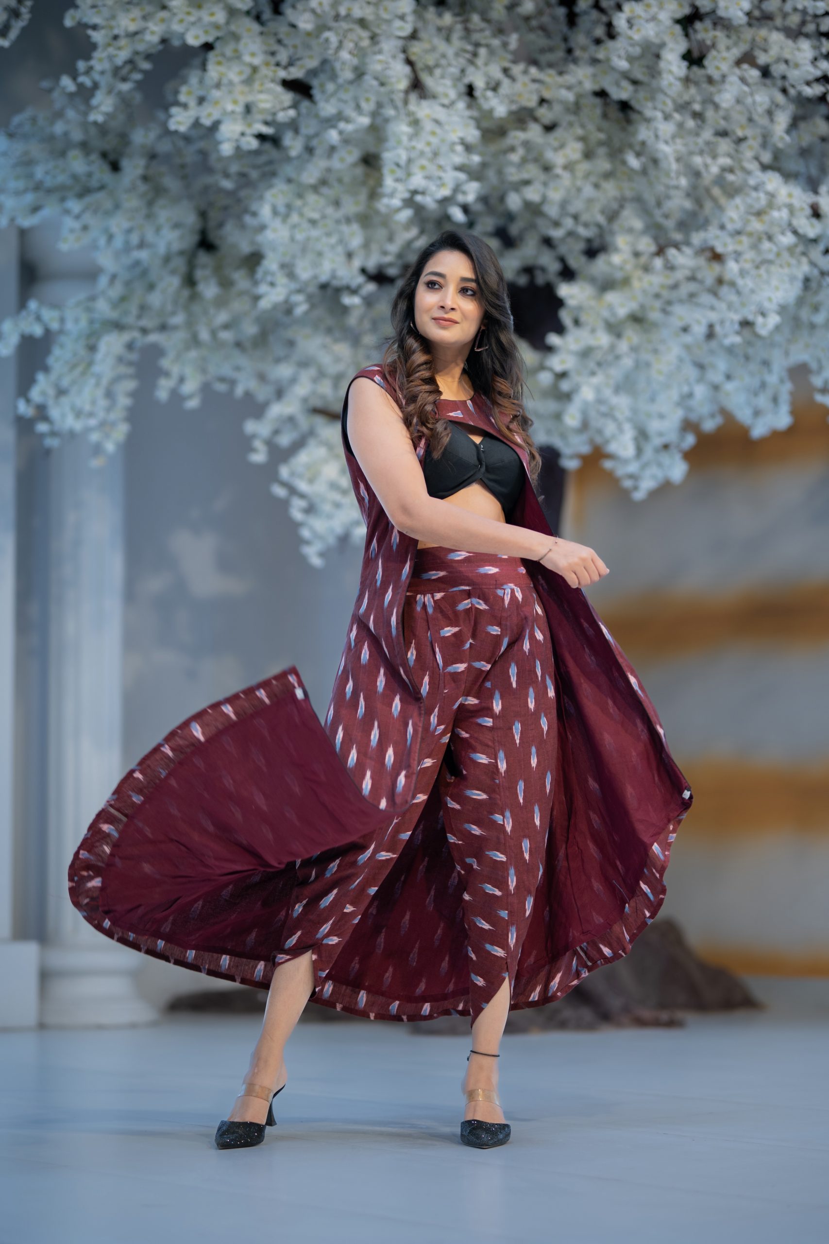 This stunning ensemble is crafted from pure Ikkat fabric, featuring timeless patterns and a rich maroon hue. The set includes a stylish sleeveless top, flowy drape jacket, and coordinated pants, blending traditional craftsmanship with a modern silhouette. Perfect for festive occasions or elegant evening wear.